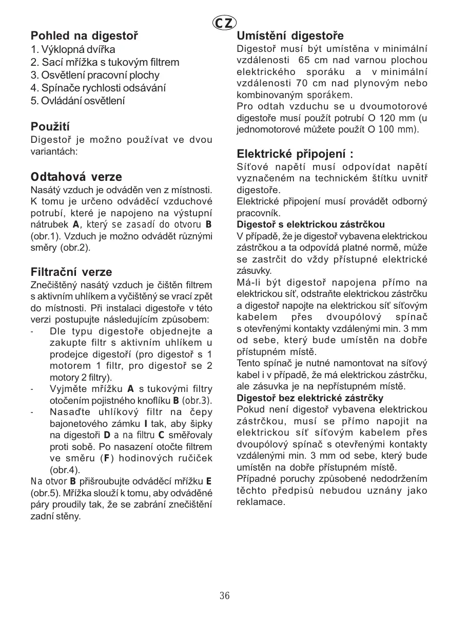 Umístìní digestoøe Digestoø musí být umístìna v minimální vzdálenosti 65 cm nad varnou plochou elektrického sporáku a v minimální vzdálenosti 70 cm nad plynovým nebo kombinovaným sporákem. Pro odtah vzduchu se u dvoumotorové digestoøe musí pouít potrubí O 120 mm (u jednomotorové mùete pouít O 100 mm). Pouití Digestoø je mono pouívat ve dvou variantách: Elektrické pøipojení : Síové napìtí musí odpovídat napìtí vyznaèeném na technickém títku uvnitø digestoøe. Elektrické pøipojení musí provádìt odborný pracovník. Digestoø s elektrickou zástrèkou V pøípadì, e je digestoø vybavena elektrickou zástrèkou a ta odpovídá platné normì, mùe se zastrèit do vdy pøístupné elektrické zásuvky. Má-li být digestoø napojena pøímo na elektrickou sí, odstraòte elektrickou zástrèku a digestoø napojte na elektrickou sí síovým kabelem pøes dvoupólový spínaè s otevøenými kontakty vzdálenými min. 3 mm od sebe, který bude umístìn na dobøe pøístupném místì. Tento spínaè je nutné namontovat na síový kabel i v pøípadì, e má elektrickou zástrèku, ale zásuvka je na nepøístupném místì. Digestoø bez elektrické zástrèky Pokud není digestoø vybavena elektrickou zástrèkou, musí se pøímo napojit na elektrickou sí síovým kabelem pøes dvoupólový spínaè s otevøenými kontakty vzdálenými min. 3 mm od sebe, který bude umístìn na dobøe pøístupném místì. Pøípadné poruchy zpùsobené nedodrením tìchto pøedpisù nebudou uznány jako reklamace. Odtahová verze Nasátý vzduch je odvádìn ven z místnosti. K tomu je urèeno odvádìcí vzduchové potrubí, které je napojeno na výstupní nátrubek A, který se zasadí do otvoru B (obr.1). Vzduch je mono odvádìt rùznými smìry (obr.2). Filtraèní verze Zneèitìný nasátý vzduch je èitìn filtrem s aktivním uhlíkem a vyèitìný se vrací zpìt do místnosti. Pøi instalaci digestoøe v této verzi postupujte následujícím zpùsobem: Dle typu digestoøe objednejte a zakupte filtr s aktivním uhlíkem u prodejce digestoøí (pro digestoø s 1 motorem 1 filtr, pro digestoø se 2 motory 2 filtry). Vyjmìte møíku A s tukovými filtry otoèením pojistného knoflíku B (obr.3). Nasaïte uhlíkový filtr na èepy bajonetového zámku I tak, aby ipky na digestoøi D a na filtru C smìøovaly proti sobì. Po nasazení otoète filtrem ve smìru (F) hodinových ruèièek (obr.4). Na otvor B pøiroubujte odvádìcí møíku E (obr.5). Møíka slouí k tomu, aby odvádìné páry proudily tak, e se zabrání zneèitìní zadní stìny.