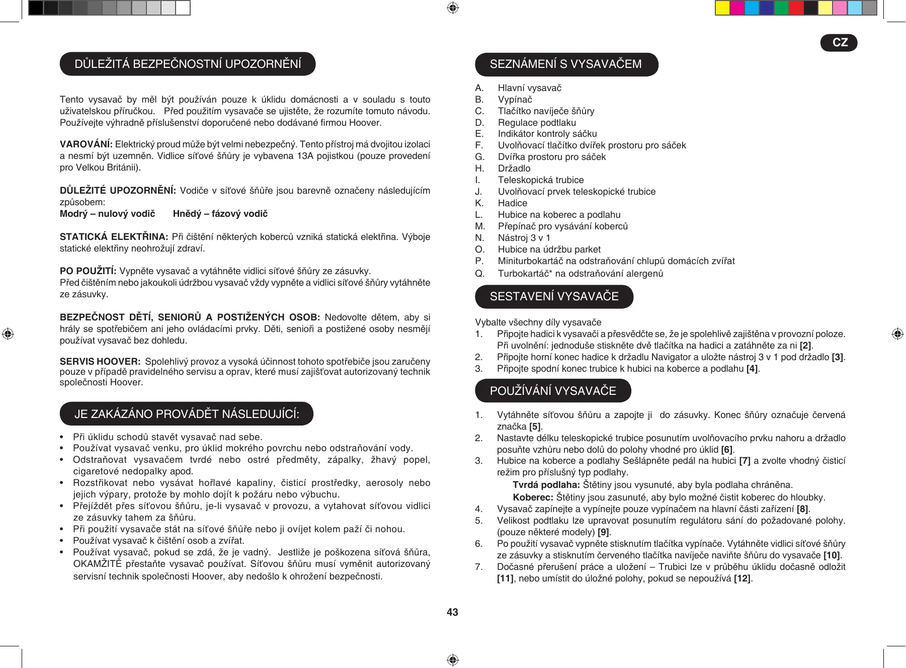 [11], nebo umístit do úložné polohy, pokud se nepoužívá [12]. Při úklidu schodů stavět vysavač nad sebe. Používat vysavač venku, pro úklid mokrého povrchu nebo odstraňování vody. Odstraňovat vysavačem tvrdé nebo ostré předměty, zápalky, žhavý popel, cigaretové nedopalky apod. Rozstřikovat nebo vysávat hořlavé kapaliny, čisticí prostředky, aerosoly nebo jejich výpary, protože by mohlo dojít k požáru nebo výbuchu. Přejíždět přes síťovou šňůru, je-li vysavač v provozu, a vytahovat síťovou vidlici ze zásuvky tahem za šňůru. Při použití vysavače stát na síťové šňůře nebo ji ovíjet kolem paží či nohou. Používat vysavač k čištění osob a zvířat. Používat vysavač, pokud se zdá, že je vadný. Jestliže je poškozena síťová šňůra, OKAMŽITĚ přestaňte vysavač používat. Síťovou šňůru musí vyměnit autorizovaný servisní technik společnosti Hoover, aby nedošlo k ohrožení bezpečnosti.