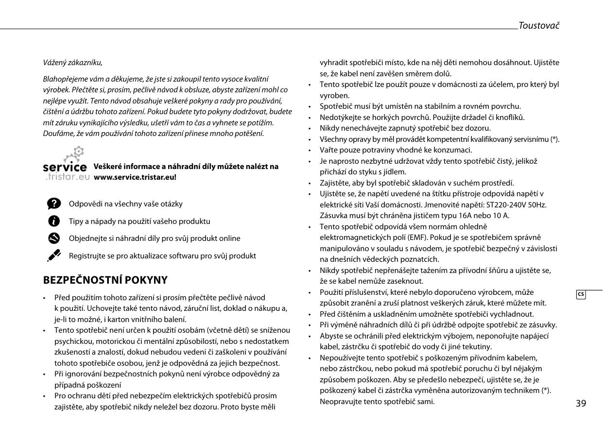 - Společnost Tristar neni zodpovedná za materiální skody nebo zraněni osob zapřićinéné nasprávném používaním nebo tím, ze osoby nerespektuji navod k použití.