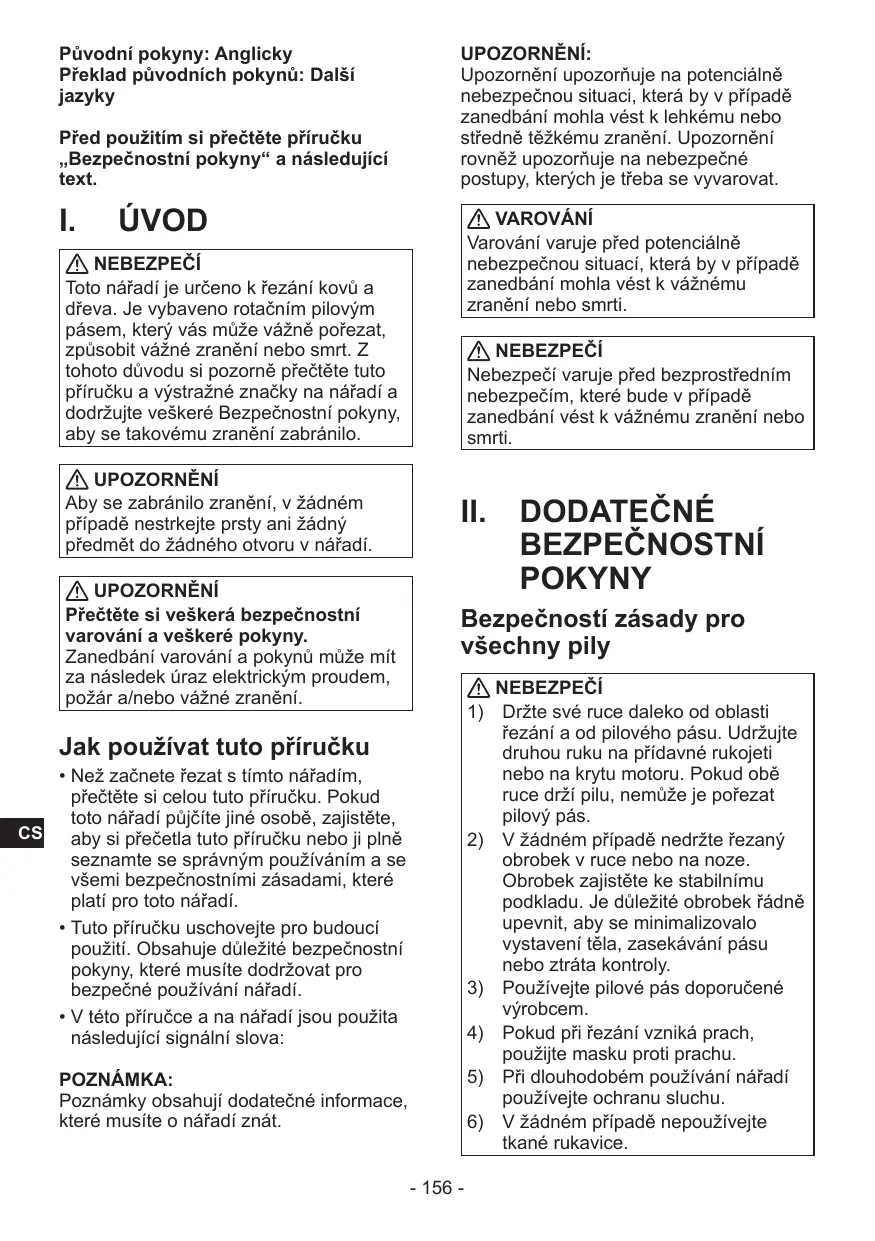 Toto nářadi je určeno k ŧezání kovú a d'reva. Je vybaveno rotačním pilovým pásem, ktery vás műže vázzně pořezat, zpúsobit vázné zraněné nebo smrt. Z tohoto duvodu si pozorně přěctěte tut o príručku a výstržné značky na nářadi a dodržujte veškeré Bezpečnostní pouyny, aby se takovému zraněné zabránilo.