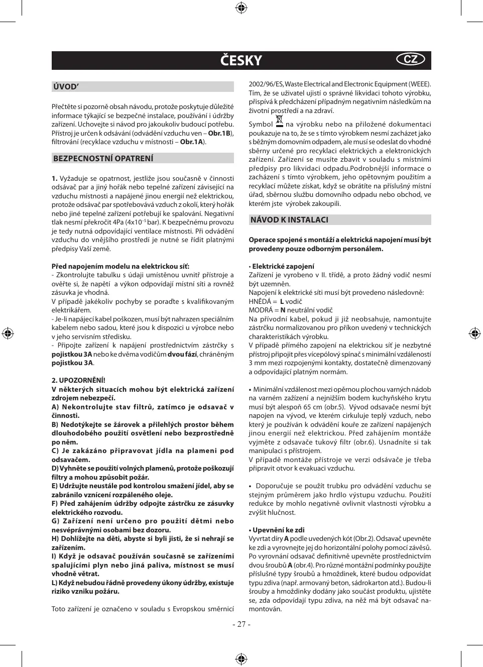 POLSC ČESKY ÚVOD’ Přečtěte si pozorně obsah návodu, protože poskytuje důležité informace týkající se bezpečné instalace, používání i údržby zařízení. Uchovejte si návod pro jakoukoliv budoucí potřebu. Přístroj je určen k odsávání (odvádění vzduchu ven – Obr.1B), filtrování (recyklace vzduchu v místnosti – Obr.1A).