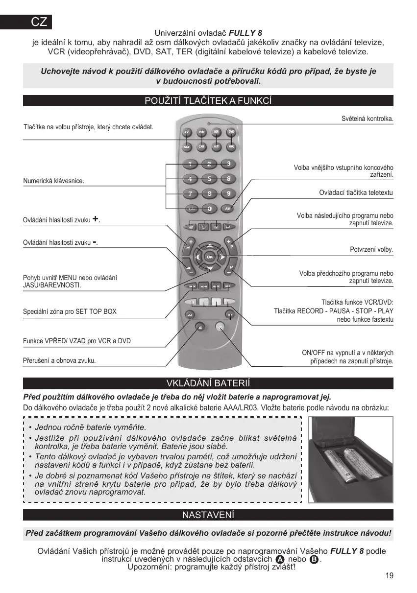 Univerzální ovladač FULLY 8 je ideální k tomu, aby nahradil až osm dálkových ovladačů jakékoliv značky na ovládání televize, VCR (videopřehrávač), DVD, SAT, TER (digitální kabelové televize) a kabelové televize. Uchovejte návod k použití dálkového ovladače a příručku kódů pro případ, že byste je v budoucnosti potřebovali.