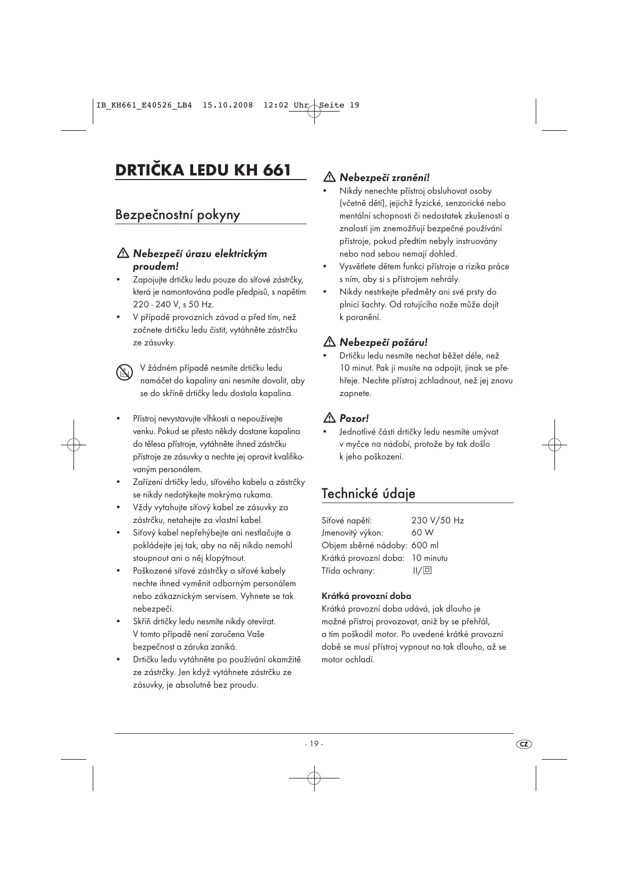 + Zapojuite drtiéku ledu pouze do sifové zästréky, které je namontoväna podle predpisb, s napétim 220 - 240 V, s 50 Hz.