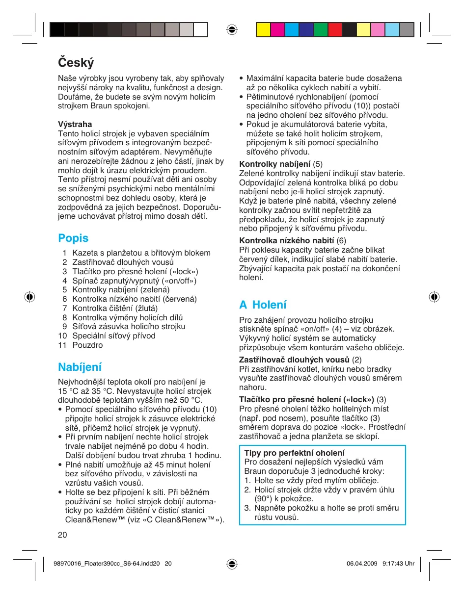 Zäruka Na tento vÿrobek poskytujeme zäruku po dobu 2 let od data prodeje spotrebiteli. Béhem této zäruëni doby bezplatné odstranime zävady na vÿrobku, zpüsobené vadami materiälu nebo chybou vÿroby. Oprava bude provedena podie naëeho rozhodnuti bud opravou nebo vÿménou celého vyÿrobku. Tato zäruka plati pro véechny zemë, kam je tento vyÿrobek dodävän firmou Braun nebo jejim autorizovanÿm distributorem. Tato zéruka se nevztahuje: na poëkozeni, vzniklé nesprävnÿm pouzivänim a ddrzbou, na bëzné opotrebeni (napr. biitového bloku a folie), jakoz i na defekty, majici zanedbatelnÿ vliv na hodnotu a pouzitelnost pristroje. Zéruka pozbÿvé platnosti, pokud byl vyÿrobek mechanicky poëkozen nebo pokud jsou opravy provedeny neautorizovanÿmi osobami nebo pokud nejsou pouzity originäini dily Braun. Pristroj je uréen vÿhradné pro domäci pouiti, Pi pouziti jinÿm zpüsobem nelze uplatnit zéruku. Poskytnutim zäruky nejsou dotéena prâva spotiebitele, které se ke koupi véci vézi podie zvléëtnich prävnich predpisü. Zäruka plati jen tehdy, je-li zäruëni list Fédnè vypinën (datum prodeje, razitko prodejny a podpis prodavaëe) a je-li souéasné s nim piedlozen prodejni doklad (déle jen doklady © koupi). Chcete-li vyuzit servisnich sluzeb v zäruëni dobé, predejte nebo poëlete kompletni piistroj spolu s doklady o koupi do autorizovaného servisniho strediska Braun. Aktualizovanÿ seznam servisnich stredisek je K dispozici v prodejnäch vÿrobkü Braun. Volejte zékaznickou infolinku 221 804 335 pro informace o vyrobcich a nejbliäsim servisnim stiedisku Braun. O pripadné vÿmênë piistroje nebo zruëeni kupni smlouvy plati prisluëné zâkonnä ustanoveni. Zäruëni doba se prodiuzuje o dobu, po kterou byl vÿrobek podie zäznamu Z opravny v zéruëni opravé.