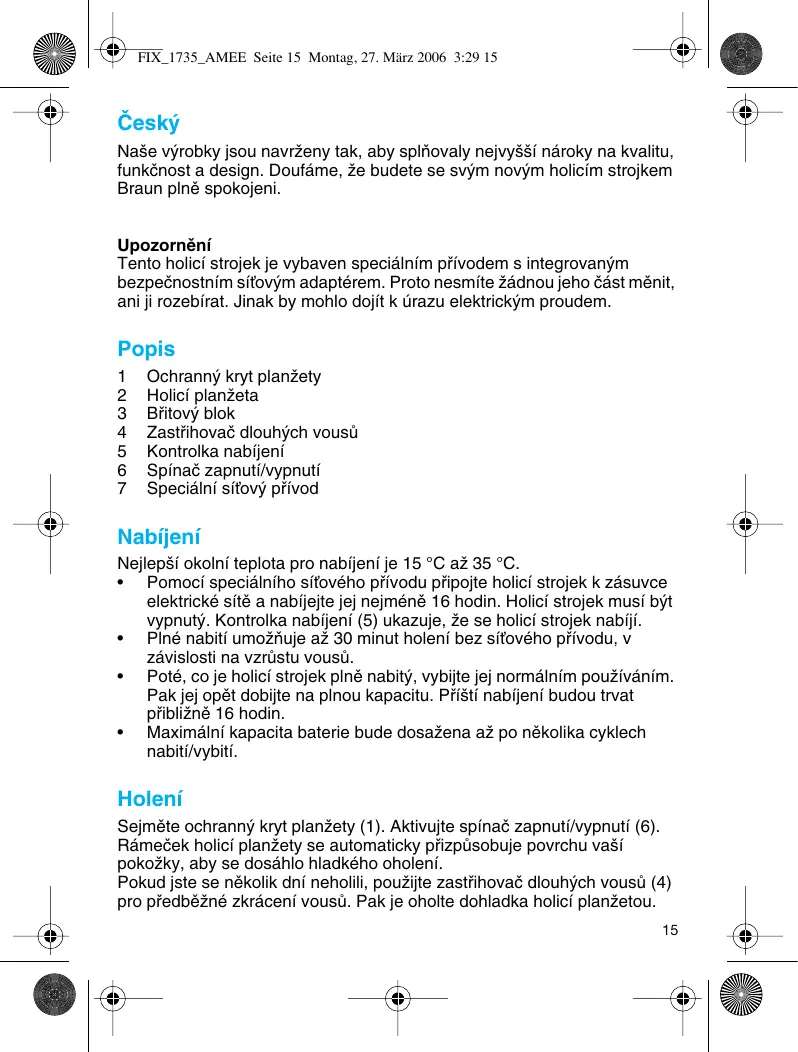 Poznämka k Zivotnimu prostredi Tento vÿrobek obsahuje akumulätorové baterie. V zäjmu ochrany Zivotniho prostiedi neodklädejte prosim tento vÿrobek po skonëeni jeho Zivotnosti do bézného domovniho odpadu. Odevzdeite jej do ms servisniho stfediska Braun nebo na prisluëné sbërné misto zïizené die predpisü ve vaëi zemi.