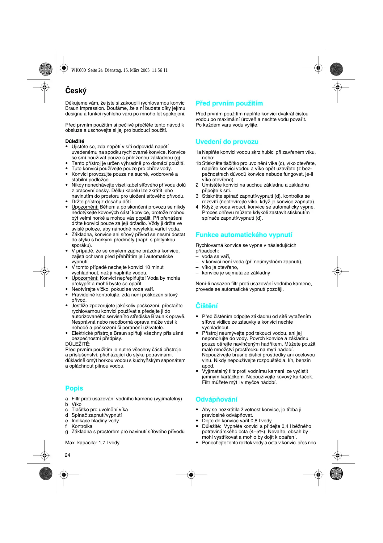 WK600 Seite 24 Dienstag, 15. März 2005 11:56 11 âesk˘ Dûkujeme vám, Ïe jste si zakoupili rychlovarnou konvici Braun Impression. Doufáme, Ïe s ní budete díky jejímu designu a funkci rychlého varu po mnoho let spokojeni. Pfied prvním pouÏitím si peãlivû pfieãtûte tento návod k obsluze a uschovejte si jej pro budoucí pouÏití. DÛleÏité