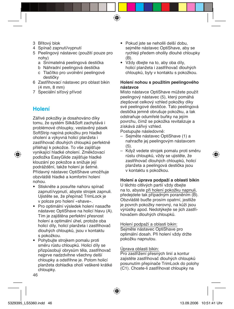towar konsumpcyjny nie wyłącza, nie ogranicza ani nie zawiesza uprawnień Kupującego wynikających z niezgodności towaru z umową. Naše výrobky jsou vyrobeny tak, aby splňovaly nejvyšší nároky na kvalitu, funkčnost a design. Braun Silk&Soft je navržen tak, aby zajišťoval perfektní a komfortní holení, jak nohou, tak i podpaží a linie bikin. Doufáme, že budete se svým novým strojkem Braun Lady shaver plně spokojeni. Upozornění Tento strojek je vybaven speciálním převodníkem na nízké napětí (speciálním síťovým přívodem se síťovým adaptérem). Proto nesmíte žádnou jeho část měnit, ani ji rozebírat. Jinak by mohlo dojít k úrazu elektrickým proudem. Speciální síťový přívod se automaticky přizpůsobuje všem napětím světové sítě (od 100 do 240 V). Z hygienických důvodů nepoužívejte tento strojek společně s jinými osobami. Pokud máte jakékoli pochybnosti ohledně použití tohoto přístroje, obraťte se prosím na svého lékaře. V následujících případech se smí tento strojek používat pouze po předchozí konzultaci s lékařem: – ekzém, poranění, zánětlivé reakce pokožky, jako je folikulitida (zánět vlasového míšku), křečové žíly – okolí mateřských znamének – snížená imunita pokožky, např. diabetes mellitus, Raynaudův syndrom – hemofilie nebo snížená imunita. Popis 1 Nástavec OptiShave 2 Holicí hlava a Holicí planžeta b SoftStrip c Změkčovací podložka EasyGlide d Zastřihovač dlouhých chloupků e Uvolňovací tlačítka f Přepínač TrimLock «trim/shave»