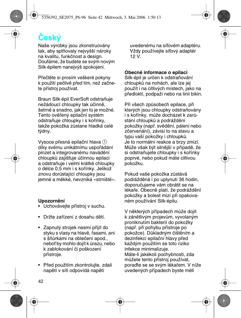 5356392_SE2075_P6-96 Seite 42 Mittwoch, 3. Mai 2006 1:50 13 âesk˘ Na‰e v˘robky jsou zkonstruovány tak, aby splÀovaly nejvy‰‰í nároky na kvalitu, funkãnost a design. Doufáme, Ïe budete se sv˘m nov˘m Silk·épilem nanejv˘‰ spokojeni. Pfieãtûte si prosím ve‰keré pokyny k pouÏití peãlivû pfied tím, neÏ zaãnete pfiístroj pouÏívat. Braun Silk·épil EverSoft odstraÀuje neÏádoucí chloupky tak úãinnû, ‰etrnû a snadno, jak jen to je moÏné. Tento ovûfien˘ epilaãní systém odstraÀuje chloupky i s kofiínky, takÏe pokoÏka zÛstane hladká celé t˘dny. Vysoce pfiesná epilaãní hlava 1 díky svému unikátnímu uspofiádání pinzet a integrovanému navádûní chloupkÛ zaji‰Èuje úãinnou epilaci a odstraÀuje i velmi krátké chloupky o délce 0,5 mm i s kofiínky. JelikoÏ znovu dorÛstající chloupky jsou jemné a mûkké, nevzniká «strni‰tû». Upozornûní