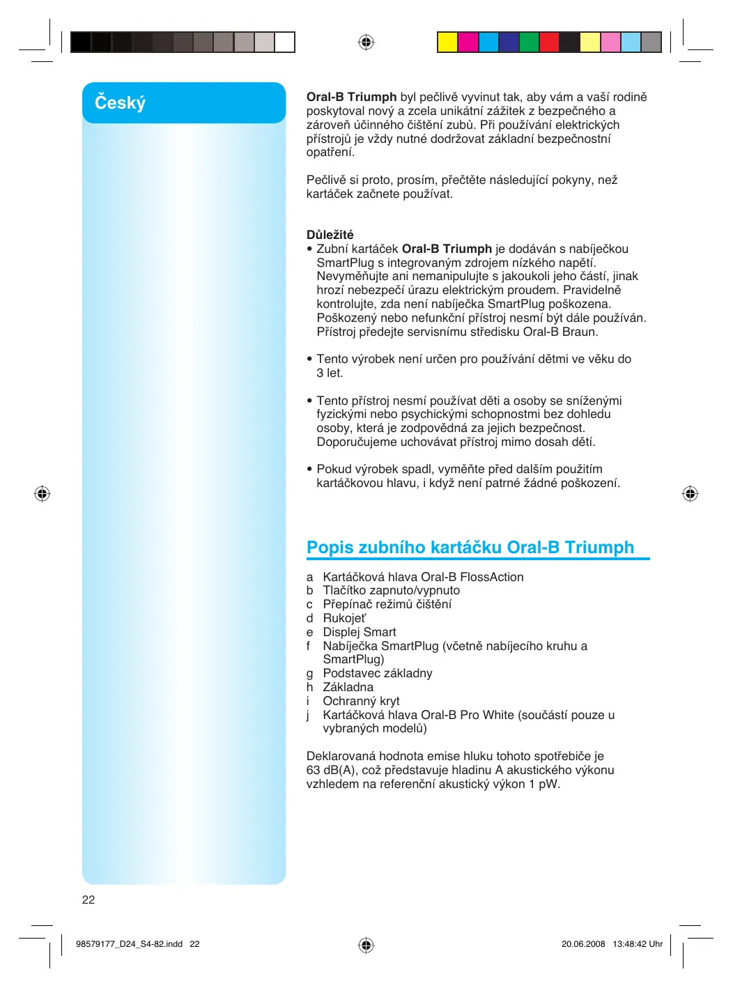 Český Oral-B Triumph byl pečlivě vyvinut tak, aby vám a vaší rodině poskytoval nový a zcela unikátní zážitek z bezpečného a zároveň účinného čištění zubů. Při používání elektrických přístrojů je vždy nutné dodržovat základní bezpečnostní opatření. Pečlivě si proto, prosím, přečtěte následující pokyny, než kartáček začnete používat. Důležité