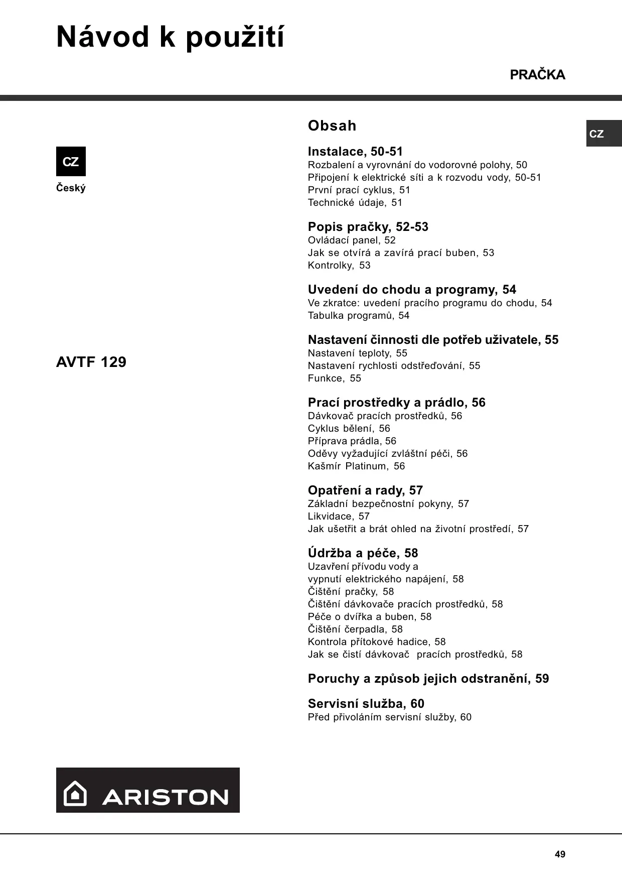 Instalace, 50-51 Rozbalení a vyrovnání do vodorovné polohy, 50 Pøipojení k elektrické síti a k rozvodu vody, 50-51 První prací cyklus, 51 Technické údaje, 51 Popis praèky, 52-53 Ovládací panel, 52 Jak se otvírá a zavírá prací buben, 53 Kontrolky, 53 Uvedení do chodu a programy, 54 Ve zkratce: uvedení pracího programu do chodu, 54 Tabulka programù, 54 Nastavení èinnosti dle potøeb uivatele, 55 AVTF 129 Nastavení teploty, 55 Nastavení rychlosti odstøeïování, 55 Funkce, 55 Prací prostøedky a prádlo, 56 Dávkovaè pracích prostøedkù, 56 Cyklus bìlení, 56 Pøíprava prádla, 56 Odìvy vyadující zvlátní péèi, 56 Kamír Platinum, 56 Opatøení a rady, 57 Základní bezpeènostní pokyny, 57 Likvidace, 57 Jak uetøit a brát ohled na ivotní prostøedí, 57 Údrba a péèe, 58 Uzavøení pøívodu vody a vypnutí elektrického napájení, 58 Èitìní praèky, 58 Èitìní dávkovaèe pracích prostøedkù, 58 Péèe o dvíøka a buben, 58 Èitìní èerpadla, 58 Kontrola pøítokové hadice, 58 Jak se èistí dávkovaè pracích prostøedkù, 58 Poruchy a zpùsob jejich odstranìní, 59 Servisní sluba, 60 Pøed pøivoláním servisní sluby, 60