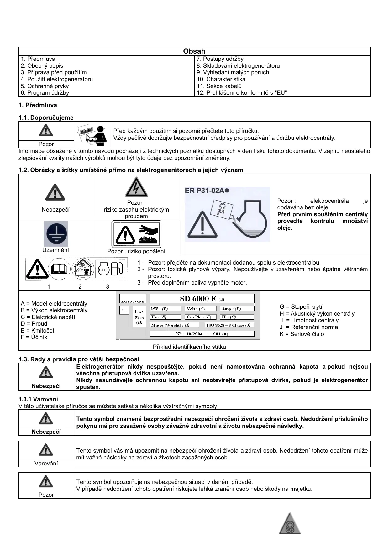 Manuel d'utilisation et d'entretien (Notice originale) 1.2. Pictogrammes et plaquettes figurant sur les groupes avec leur signification