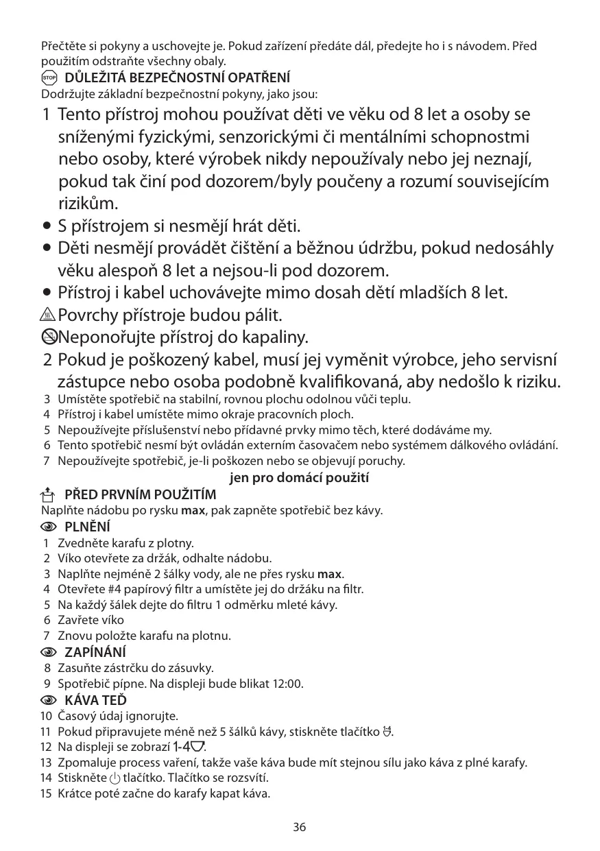 1 Tento přístroj mohou používat děti ve věku od 8 let a osoby se sníženými fyzickými, senzorickými či mentálními schopnostmi nebo osoby, které výrobek nikdy nepoužívaly nebo jej neznají, pokud tak činí pod dozorem/byly poučeny a rozumí souvisejícím rizikům. • S přístrojem si nesmějí hrát děti. • Děti nesmějí provádět čištění a běžnou údržbu, pokud nedosáhly věku alespoň 8 let a nejsou-li pod dozorem. • Přístroj i kabel uchovávejte mimo dosah dětí mladších 8 let. h Povrchy přístroje budou pálit. lNeponořujte přístroj do kapaliny. 2 Pokud je poškozený kabel, musí jej vyměnit výrobce, jeho servisní zástupce nebo osoba podobně kvalifikovaná, aby nedošlo k riziku. 3 4 5 6 7