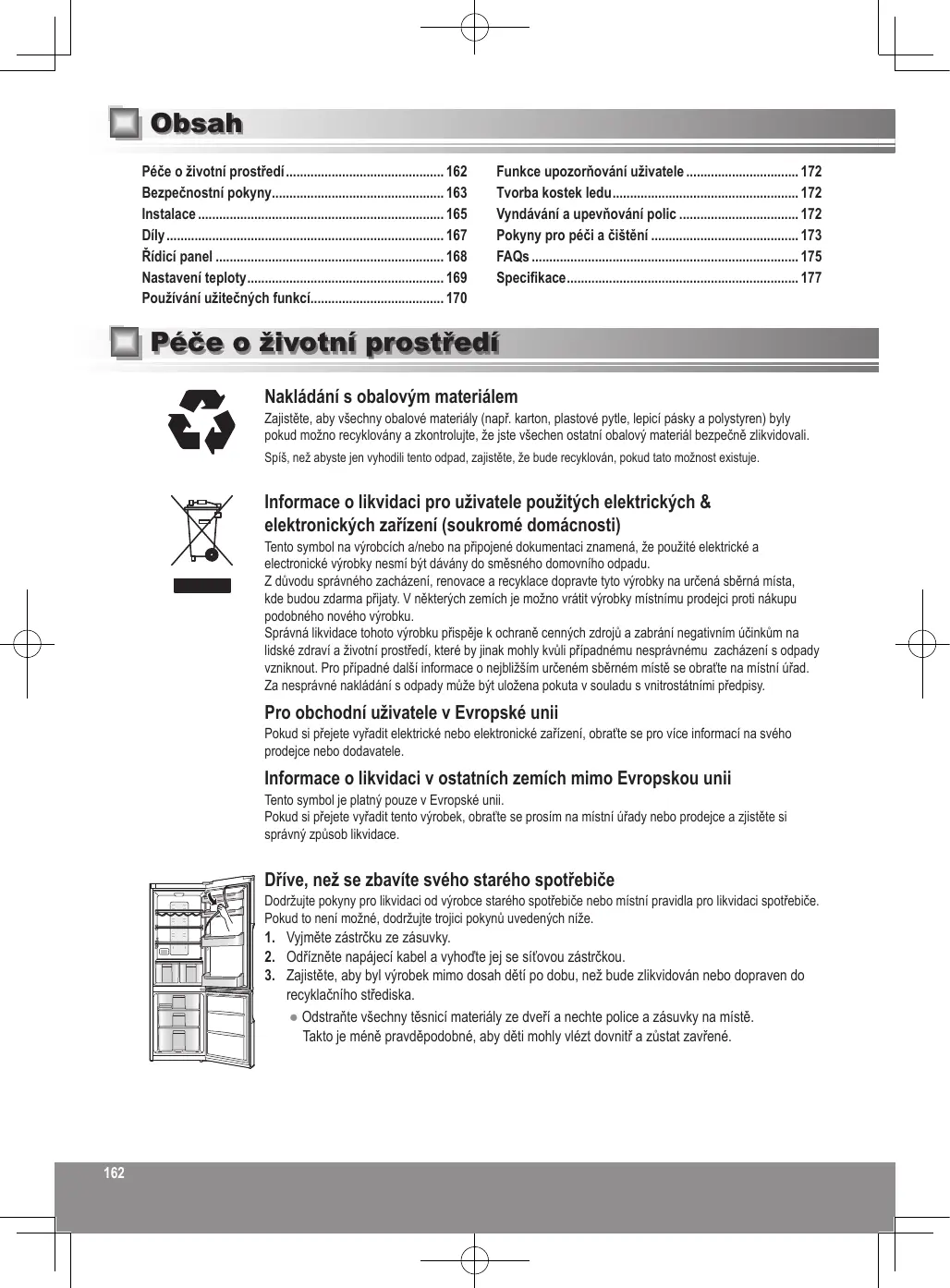 Obsah Péče o životní prostředí 162 Bezpečnostní pokyny 163 Instalace 165 Díly 167 Řídicí panel 168 Nastavení teploty 169 Používání užitečných funkcí 170