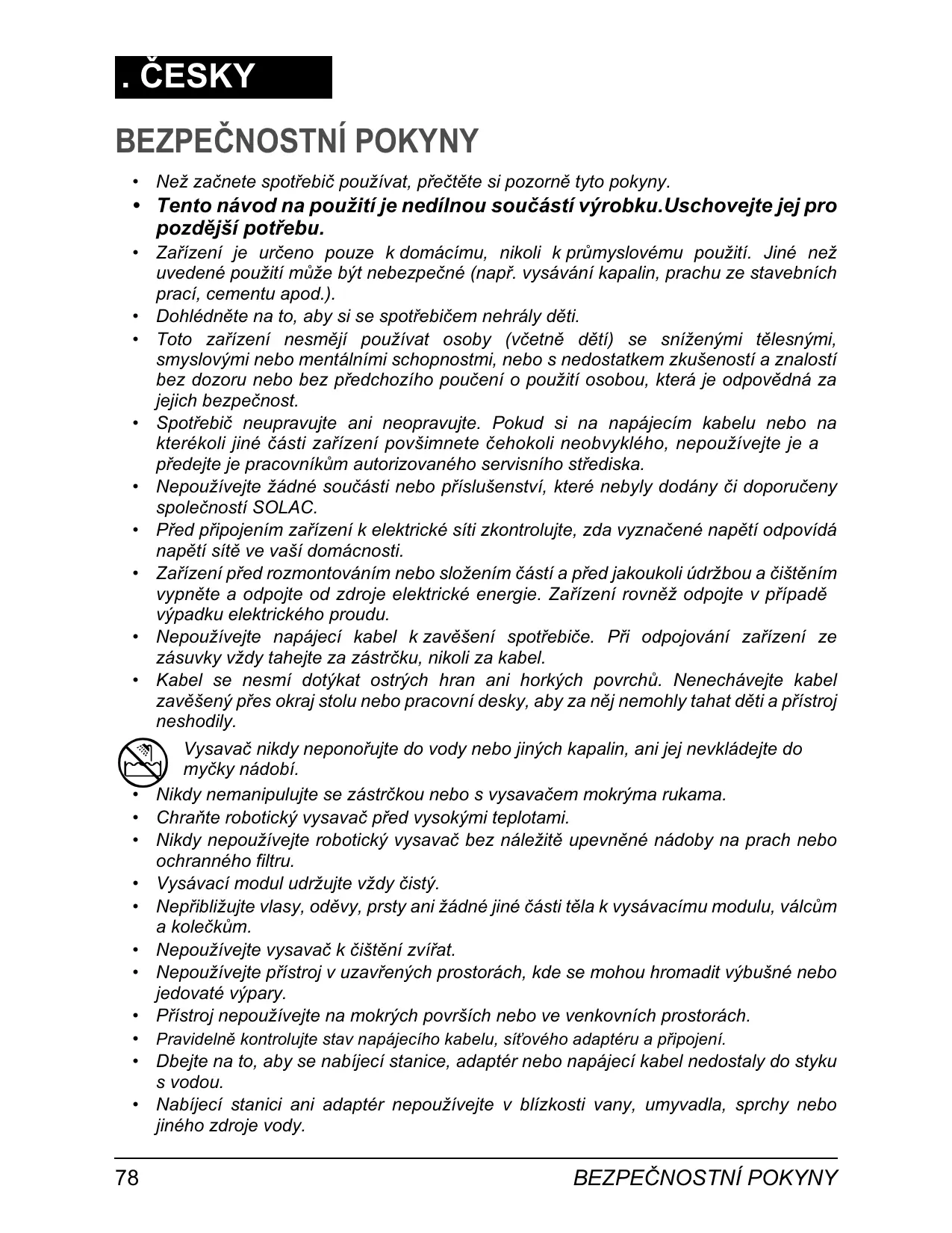Vysava nikdy neponoujte do vody nebo jiných kapalin, ani jej nevkládejte do myky nádobí. Nikdy nemanipulujte se zástrkou nebo s vysavaem mokrýma rukama. Chrate robotický vysava ped vysokými teplotami. Nikdy nepoužívejte robotický vysava bez náležit upevnné nádoby na prach nebo ochranného filtru. Vysávací modul udržujte vždy istý. Nepibližujte vlasy, odvy, prsty ani žádné jiné ásti tla k vysávacímu modulu, válcm a kolekm. Nepoužívejte vysava k ištní zvíat. Nepoužívejte pístroj v uzavených prostorách, kde se mohou hromadit výbušné nebo jedovaté výpary. Pístroj nepoužívejte na mokrých površích nebo ve venkovních prostorách.