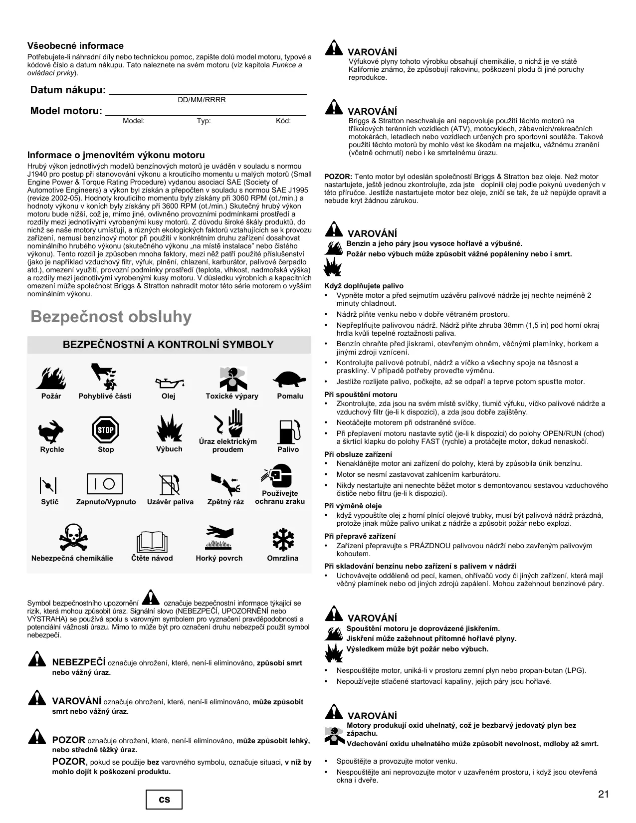 À VAROVANI Motory produkuji oxid uhelnatÿ, coë je bezbarvÿ jedovatÿ plyn bez zâpachu. PCR vacchovini oxidu uhelnatého müe zpüsobit nevoinost, mdloby aë smrt. + Spoustëjte a provozujte motor venku + Nespouëtéjte ani neprovozujte motor v uzavfeném prostoru, i kdyz jsou otevienä okna i dveñe. POZOR: Tento motor byl odeslän spoleënosti Briggs & Stratton bez oleje. Nez motor nastartujete, jeëté jednou zkontrolujte, zda jste dopinili olej podie pokynü uvedenÿch v této priruëce. Jestlize nastartujete motor bez oleje, poëkodi se tak, Ze uZ nepüjde opravit a nebude kryt Zâdnou zérukou.