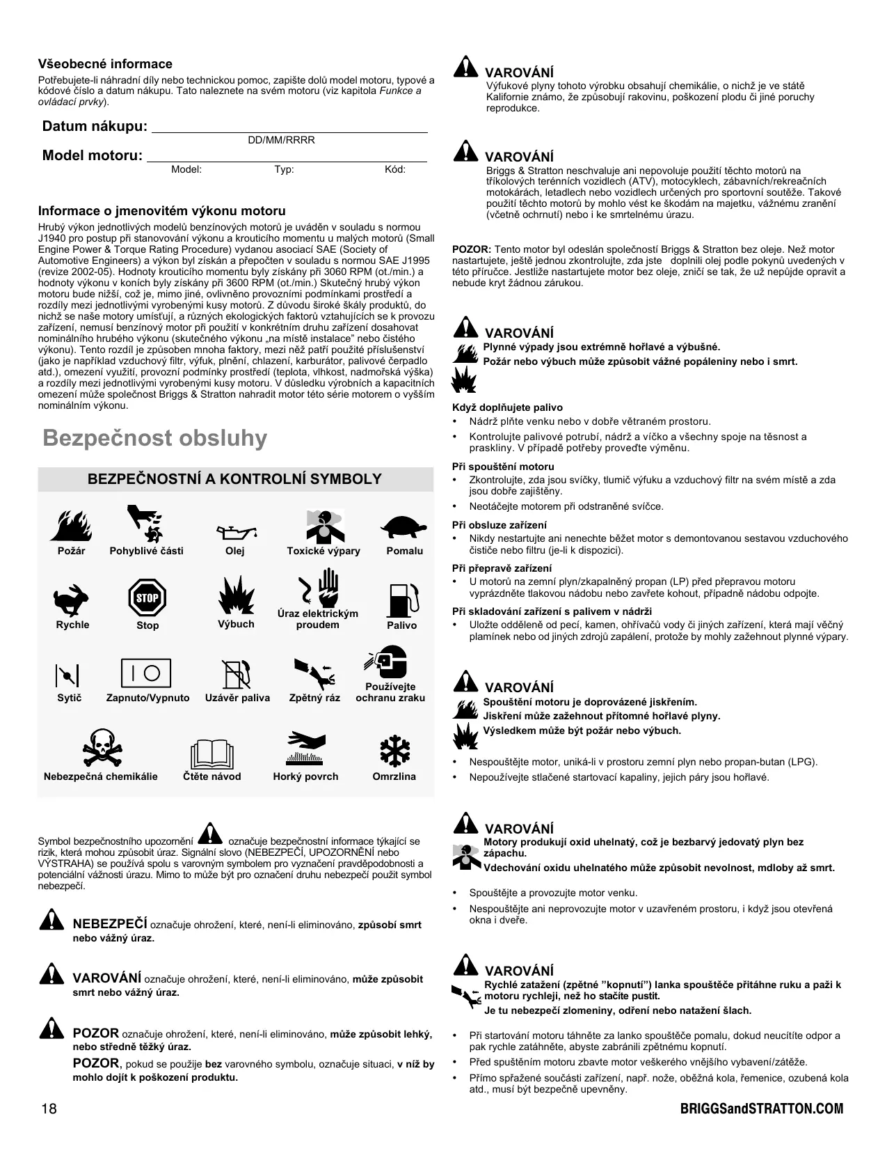 Vé&eobecné informace Potrebujete-li nhradni dily nebo technickou pomoc, zapite dolü model motoru, typové a kédové ëislo a datum nékupu, Tato naleznete na svém motoru (viz kapitola Funkce a ovlädaci prvky). Datum näkupu: DDIMM/RRRR Model motoru: Model: Typ: Kg: Informace o jmenovitém vÿkonu motoru Hrubÿ vÿkon jednotivÿch modelü benzinovÿch motorü je uvädën v souladu s normou 41940 pro postup pi Stanovoväni wÿkonu a krouticiho momentu u malÿch motorü (Small Engine Power & Torque Rating Procedure) vydanou asociaci SAE (Society of Automotive Engineers) a vÿkon byl ziskän a prepoëten v souladu s normou SAE J1995 (revize 2002-05). Hodnoty krouticiho momentu byiy ziskäny phi 3060 RPM (ot./min.) a hodnoty vÿkonu v konich byly ziskäny pfi 3600 RPM (ot./min.) Skuteënÿ hrubÿ vÿkon motoru bude niz8i, coz je, mimo jiné, ovlivnèno provoznimi podminkami prostredi a rozdily mezi jednoivÿmi vyrobenÿmi kusy motorü. Z düvodu &iroké &käly produktü, do nichz se naëe motory umistujf, a rüznÿch ekologickÿch faktorü vztahujicich se k provozu zaïizeni, nemusi benzinovÿ motor pfi pouziti v konkrétnim druhu zaïizeni dosahovat nominälniho hrubého vÿkonu (skuteëného vÿkonu ,na misté instalace” nebo ëistého vÿkonu). Tento rozdil je zpüsoben mnoha faktory, mezi nëz patfi pouzité pHisluéenstvi Gako je napriklad vzduchovÿ fitr, wyfuk, pinéni, chlazeni, karburätor, palivové éerpadlo atd.), omezeni vyuäiti, provozni podminky prostredi (teplota, vinkost, nadmoïské vÿëka) a rozdily mezi jednotiivÿmi vyrobenyÿmi kusy motoru. V düsledku vÿrobnich a kapacitnich omezeni müze spoleënost Briggs & Stratton nahradit motor této série motorem 0 vySsim nominäinim vÿkonu. Bezpeënost obsluhy