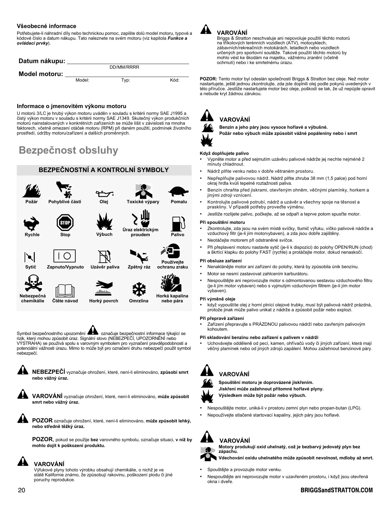À VAROVANI Briggs & Stration neschvaluje ani nepovoluje pouziti téchto motorü na tfikolovÿch terénnich vozidiech (ATV), motocyklech, zäbavnich/rekreaënich motokäräch, letadlech nebo vozidiech uréenÿch pro sportovni soutëze. Takové pouziti téchto motorü by mohlo vést ke &kodäm na majetku, véznému zranëni (véetnè ochrnuti) nebo i ke smrtelnému drazu POZOR: Tento motor byl odeslän spoleënosti Briggs & Stratton bez oleje. Nez motor nastarujete, jeëté jednou zkontrolujte, zda jste dopinil olej podie pokynü uvedenÿch v této priruëce. Jestiize nastartujete motor bez oleje, poSkodi se tak, 2e uZ nepüjde opravit a nebude kryt Zädnou zärukou. À VAROVANI Benzin a jeho päry jsou vysoce hoïlavé a vÿbuëné. Poëär nebo vÿbuch müëe zpüsobit véäné popäleniny nebo i smrt Kdy£ doplñujete palivo + Vypnête motor a pred sejmutim uzävêru palivové nädr£e jej nechte nejméné 2 minuty chladnout. + Nädrz lite venku nebo v dobfe vêtraném prostoru. + Neprepläujte palivovou ndrz. Nädrz plite zhruba 38 mm (1,5 palce) pod horni okraj hrdla kvüli tepelné roztaznosti paliva. + Benzin chrañte pred jiskrami, otevrenÿm ohnèm, véényÿmi plaminky, horkem a Jinÿmi zdroj vznicent + Kontrolujte palivové potrubi, nâdrz a uzävër a v&echny spoje na tésnost a praskliny. V pripadé potreby provedte vÿménu + Jestiize rozljete palivo, poëkejte, az se odpañi a teprve potom spustte motor. PHi spouëténi motoru + Zkontrolujte, zda jsou na svém misté sviëky, tlumié vÿfuku, viéko palivové nädre a vzduchovÿ fitr (je-lijim motorvybaven), a zda jsou dobre zajiétény. + Neotééejte motorem pri odstranëné sviéce. + Pri pfeplaveni motoru nastavte syti (je-li k dispozici) do polohy OPEN/RUN (chod) a &krlici klapku do polohy FAST (rychle) a protäéejte motor, dokud nenaskoël. Pi obsluze zaïizeni + Nenaklänëjte motor ani zafizeni do polohy, kterä by zpüsobila ünik benzinu: + Motor se nesmi zastavovat zahicenim karburätoru + Nespouëtéjte ani neprovozujte motor s odmontovanou sestavou vzduchového filtru (ie-li im motor vybaven) nebo s vyjmutÿm vzduchovÿm fltrem (je-li jim motor wybaven). PHi vÿmëné oleje + kdy2 vypouëtite olej z horni pinici olejové trubky, musi bjt palivové nädrz prézdné, protoze jinak müze palivo unikat z nädrée a zpüsobit pozär nebo explozi Püi prepravë zaïizeni + Zaïizeni prepravujte s PRAZDNOU palivovou nädrzi nebo zavfenÿm palivovÿm kohoutem. PHi skladoväni benzinu nebo zaïizeni s palivem v nädräi + Uchoväveite oddélenë od peci, kamen, ohfivaëü vody ë jinÿch zafizeni, kterä majf véënÿ plaminek nebo od jinÿch zdrojü zapäleni. Mohou zaZehnout benzinové päry
