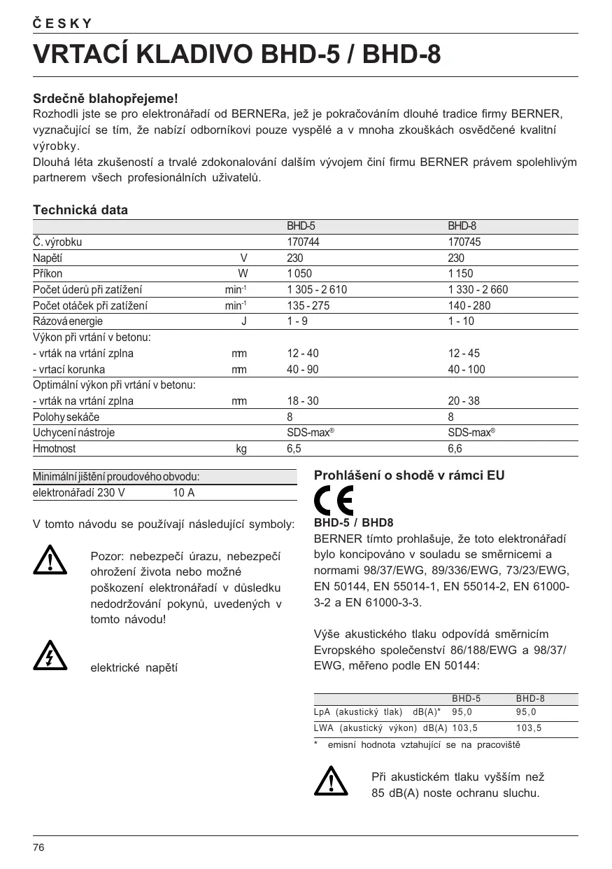 ČESKY VRTACÍ KLADIVO BHD-5 / BHD-8 Srdečně blahopřejeme! Rozhodli jste se pro elektronářadí od BERNERa, jež je pokračováním dlouhé tradice firmy BERNER, vyznačující se tím, že nabízí odborníkovi pouze vyspělé a v mnoha zkouškách osvědčené kvalitní výrobky. Dlouhá léta zkušeností a trvalé zdokonalování dalším vývojem činí firmu BERNER právem spolehlivým partnerem všech profesionálních uživatelů.