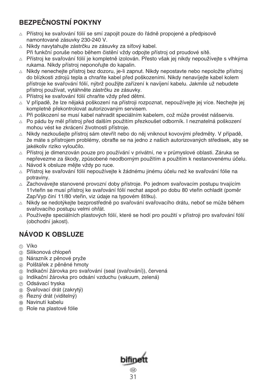Bedienings- en veiligheidsaanwijzingen Àԉ›ÍÂȘ ¯ÂÈÚÈÛÌÔ‡ Î·È ·ÛÊ·Ï›·˜ Wskazówki dotyczàce obs∏ugi i bezpieczeƒstwa Pokyny k ovládání Débranchez toujours l'appareil en cas de défaut de fonctionnement ou pour le nettoyage. L'appareil à souder est entièrement isolé. Cependant, ne l'utilisez jamais avec des mains humides. Ne plongez jamais l'appareil dans un liquide. Ne laissez jamais l'appareil en marche sans surveillance. Ne placez jamais l'appareil à proximité de sources de chaleur et protégez le cordon de tout endommagement. N'enroulez jamais le cordon autour de l'appareil, utilisez pour cela le dispositif d'enroulement prévu à cet effet. Débranchez la prise de l'appareil dès que vous ne l'utilisez plus. Conservez toujours l'appareil hors de portée des enfants. Si l'appareil est manifestement endommagé, ne l'utilisez plus. Faites-le soumettre à un examen complet par un SAV agréé. En cas d'endommagement du cordon, celui-ci doit être remplacé par un cordon spécial, que vous pouvez vous procurer auprès de notre SAV. Si l'appareil est tombé, le faire contrôler par un spécialiste avant de le réutiliser. Même des endom magements non visibles peuvent diminuer la longévité de l'appareil. N'essayez jamais d'ouvrir vous-même l'appareil ou d'y faire entrer des objets en métal. En cas de problèmes avec l'appareil, adressez-vous à l'un de nos SAV agréés afin d'exclure tout risque. L'appareil n'est conçu que pour un usage domestique, et non pour un usage commercial. Il n'est assumé aucune garantie ni responsabilité pour tous dommages résultant d'une utilisation erronée et non adaptée de l'appareil. Tenez toujours le mode d'emploi à portée de la main. N'utilisez jamais l'appareil dans un but autre que l'emballage de produits alimentaires. Respectez les durées d'utilisation données pour l'appareil. Après une procédure de soudage de 11 secondes, l'appareil doit refroidir pendant au moins 80 secondes (rapport Marche/Arrêt 11/80 sec., voir données sur la plaque signalétique). Ne touchez jamais le fil soudeur immédiatement après le travail, car il devient brûlant pendant l'opération. Utilisez uniquement des films plastiques spéciaux pouvant être utilisés avec un appareil à souder (qualité commerciale).