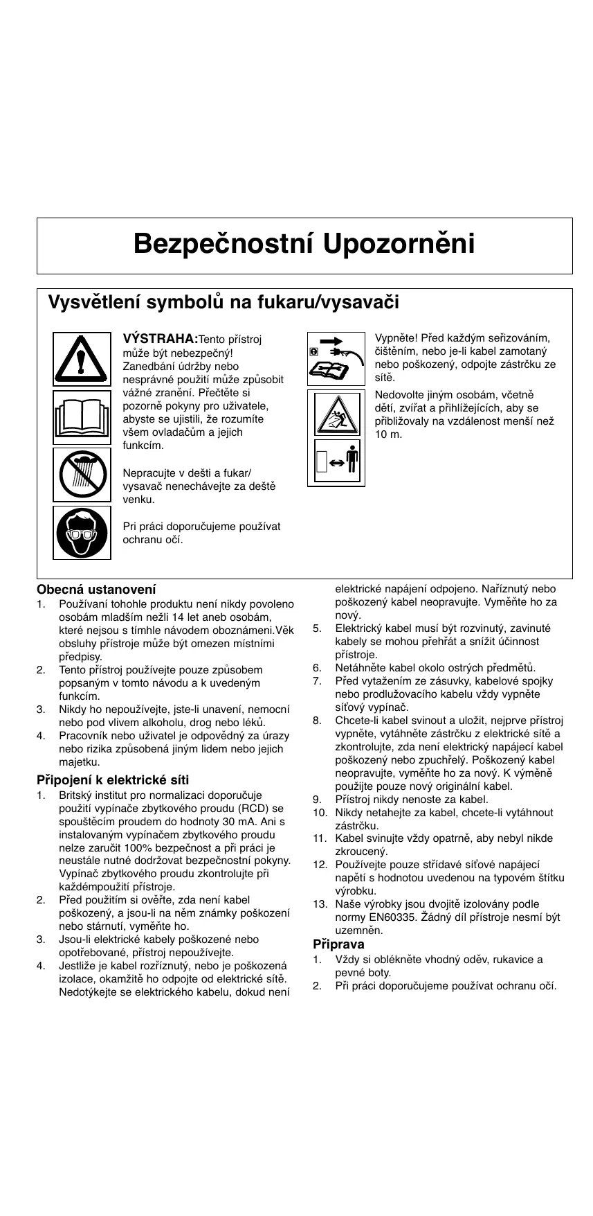 Ja, niżej podpisany M. Bowden z Działu Produktów Zewnetrznych, Aycliffe Industrial Park, NEWTON AYCLIFFE, Co. Durham. DL5 6UP., zaświadczam, że próbka ww. produktu została poddana próbom, których podstawę stanowiła norma ISO 5349. Maksymalna wartość pierwiastka ważonej średniej wibracji zarejestrowanych w pozycji ręki operatora wynosi: Typ Gwarantowany poziom mocy dzwieku Zmierzony poziom mocy dzwieku Poziom Wartosc Nominalny przeplyw powietrza Waga Twister 2000 107 dB(A) 105 dB(A) 92 dB(A) 15 m/s2 0,167 m3/s 4,2 kg Newton Aycliffe, 13/06/2006 M. Bowden, Dyrektor Dział Badań i Rozwoju Bezpečnostní Upozorněni Vysvětlení symbolů na fukaru/vysavači Vypněte! Před každým seřizováním, čištěním, nebo je-li kabel zamotaný nebo poškozený, odpojte zástrčku ze sítě. VÝSTRAHA:Tento přístroj může být nebezpečný! Zanedbání údržby nebo nesprávné použití může způsobit vážné zranění. Přečtěte si pozorně pokyny pro uživatele, abyste se ujistili, že rozumíte všem ovladačům a jejich funkcím. Nedovolte jiným osobám, včetně dětí, zvířat a přihlížejících, aby se přibližovaly na vzdálenost menší než 10 m. Nepracujte v dešti a fukar/ vysavač nenechávejte za deště venku. Pri práci doporučujeme používat ochranu očí. Obecná ustanovení