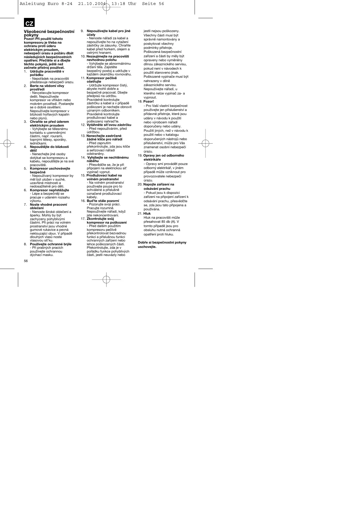 CZ Všeobecné bezpečnostní pokyny Pozor! Při použití tohoto kompresoru je třeba na ochranu proti úderu elektrickým proudem, nebezpečí úrazu a požáru dbát následujících bezpečnostních opatření. Přečtěte si a dbejte těchto pokynů, ještě než začnete přístroj používat. 1. Udržujte pracoviště v pořádku - Nepořádek na pracovišti představuje nebezpečí úrazu. 2. Berte na vědomí vlivy prostředí - Nevystavujte kompresor dešti. Nepoužívejte kompresor ve vlhkém nebo mokrém prostředí. Postarejte se o dobré osvětlení. Nepoužívejte kompresor v blízkosti hořlavých kapalin nebo plynů. 3. Chraňte se před úderem elektrickým proudem - Vyhýbejte se tělesnému kontaktu s uzemněnými částmi, např. rourami, topnými tělesy, sporáky, ledničkami. 4. Nepouštějte do blízkosti děti! - Nenechejte jiné osoby dotýkat se kompresoru a kabelu, nepouštějte je na své pracoviště. 5. Kompresor uschovávejte bezpečně - Nepoužívaný kompresor by měl být uložen v suché, uzavřené místnosti a nedosažitelně pro děti. 6. Kompresor nepřetěžujte - Lépe a bezpečněji se pracuje v udaném rozsahu výkonu. 7. Noste vhodné pracovní oblečení - Nenoste široké oblečení a šperky. Mohly by být zachyceny pohyblivými částmi. Při práci na volném prostranství jsou vhodné gumové rukavice a pevná neklouzající obuv. V případě dlouhých vlasů noste vlasovou sít’ku. 8. Používejte ochranné brýle - Při prašných pracích používejte ochrannou dýchací masku. 56