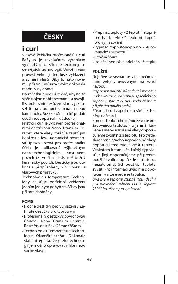 - Izolační podložka odolná vůči teplu ČESKY i curl Vlasová žehlička profesionálů i curl BaByliss je revolučním výrobkem vyvinutým na základě těch nejmodernějších technologií. Umožní vám provést velmi jednoduše vyhlazení a zvlnění vlasů. Díky tomuto novému přístroji můžete tvořit dokonale módní vlny doma! Na začátku bude užitečné, abyste se s přístrojem dobře seznámili a osvojili si práci s ním. Můžete si to vyzkoušet třeba s pomocí kamaráda nebo kamarádky. Brzy se vám určitě podaří dosáhnout optimální výsledky! Přístroj i curl je vybaven profesionálními destičkami Nano Titanium Ceramic, které vlasy chrání a zajistí jim hebkost a lesk. Keramická povrchová úprava určená pro profesionální účely je aplikovaná výjimečným nano-technologickým postupem: povrch je tvrdší a hladší než běžný keramický povrch. Destičky jsou dokonale přizpůsobeny vlivu barev a vlasových přípravků. Technologie i Temperature Technology zajišťuje perfektní vyhlazení jedním jediným pohybem. Vlasy jsou při tom chráněny. POUŽITÍ Nejdříve se seznamte s bezpečnostními pokyny uvedenými na konci návodu. Při prvním použití může dojít k malému úniku kouře a ke vzniku specifického zápachu: tyto jevy jsou zcela běžné a při příštím použití zmizí. Přístroj i curl zapojte do sítě a stiskněte tlačítko I. Pomocí teplotního měniče zvolte požadovanou teplotu. Pro jemné, barvené a/nebo narušené vlasy doporučujeme zvolit nižší teplotu. Pro tvrdé, zkadeřené a/nebo nepoddajné vlasy doporučujeme zvolit vyšší teplotu. Vzhledem k tomu, že každý typ vlasů je jiný, doporučujeme při prvním použití zvolit stupeň • Je-li to třeba, můžete při dalších použitích teplotu zvýšit. Pro informaci uvádíme doporučení v níže uvedené tabulce. Dva první teplotní stupně jsou ideální pro provedení zvlnění vlasů. Teplota 230°C je určena pro vyhlazení. POPIS