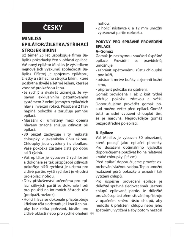 B-Epilace V43 Miniliss je vybaven 30 pinzetami, Které pracuj{ jako_epilaëni. pinzetky. Pro. dosazenf _optimélniho _ vysledku doporuëujeme pouäivat ho na relativnë krétké chloupky (0,5 cm).