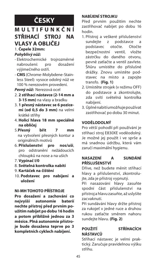5. L ame de précision 7mm, pour dessiner avec précision contours et motifs originaux 6. Accessoire nez/oreilles, pour éliminer les poils indésirables du nez et des oreilles 7. Interrupteur I/0 8. Témoin lumineux de charge 9. B rosse de nettoyage 10. S ocle de chargement et de rangement