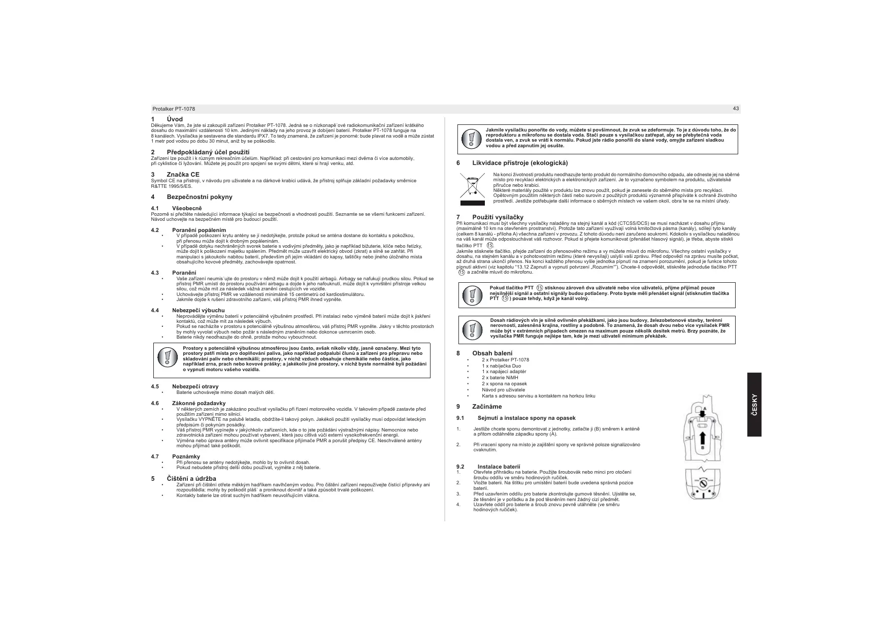 Dekjumele Vám, zé jste si zakoupii zafizeni Protalker TK-1078. Jedná se o nízkonapě odve radiokomunikačni zafizeni krátěko dosahu do maximižný vázděstán 100. Jedný námiřa na jady provože je robijen bateri. Batalov TK-1078 fungue na 8 kaněčěch. Vysslacka je sestavena de straduro IPX7. Tóte znazmeno, zé zafizeni je pönorré: bude platav na vodě a muže zústat 1 metr podvodu po dobot 30 min, anüt by se pavkodiló.