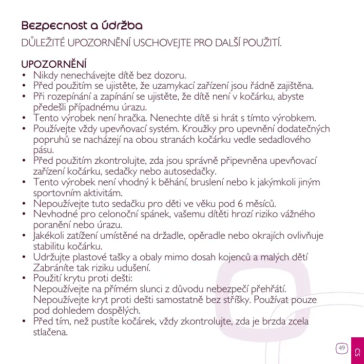 • Pour éviter toute blessure, maintenir votre enfant à l’écart lors du dépliage et du pliage du produit. • Ne pas laisser votre enfant jouer avec ce produit. • Toujours utiliser le système de retenue. Des anneaux pour la fixation d’un harnais supplémentaire sont situés au niveau de la ceinture de maintien, de chaque côté. • Vérifier que les dispositifs de fixation de la nacelle, du siège ou du siège-auto sont correctement enclenchés avant utilisation. • Ne pas utiliser ce produit en faisant du jogging ou des promenades en rollers et toutes autres activités sportives. • Ne pas utiliser ce siège pour des enfants de moins de 6 mois. • Ne convient pas pour de longue période de sommeil, votre enfant risquerait d’être en danger. • Le fait d’accrocher une charge au poussoir, dossier ou côtés influe sur la stabilité du landau/de la poussette. • Pour éviter les risques d’étouffement, conservez les sacs plastique de l’emballage hors de portée des bébés et des jeunes enfants. • Utilisation de l’habillage-pluie: Ne pas utiliser en cas de temps ensoleillé, pour cause de chaleur excessive. Ne pas utiliser l’habillage pluie sans la capote. A utiliser sous la surveillance d’un adulte. • Toujours vérifier que le frein est bien engagé avant de lâcher votre poussette. • Ne jamais laisser votre enfant monter et descendre seul de la poussette. • Les pneus peuvent laisser des traces noires sur certains sols (surtout les sols lisses comme les parquets, les laminés synthétiques, le linoléum, etc.). 19