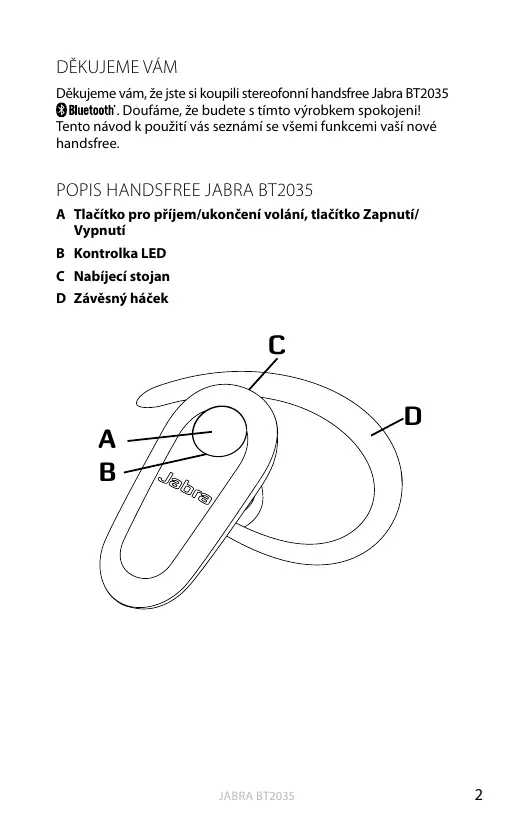 Děkujeme vám Děkujeme vám, že jste si koupili stereofonní handsfree Jabra BT2035 . Doufáme, že budete s tímto výrobkem spokojeni! Tento návod k použití vás seznámí se všemi funkcemi vaší nové handsfree.