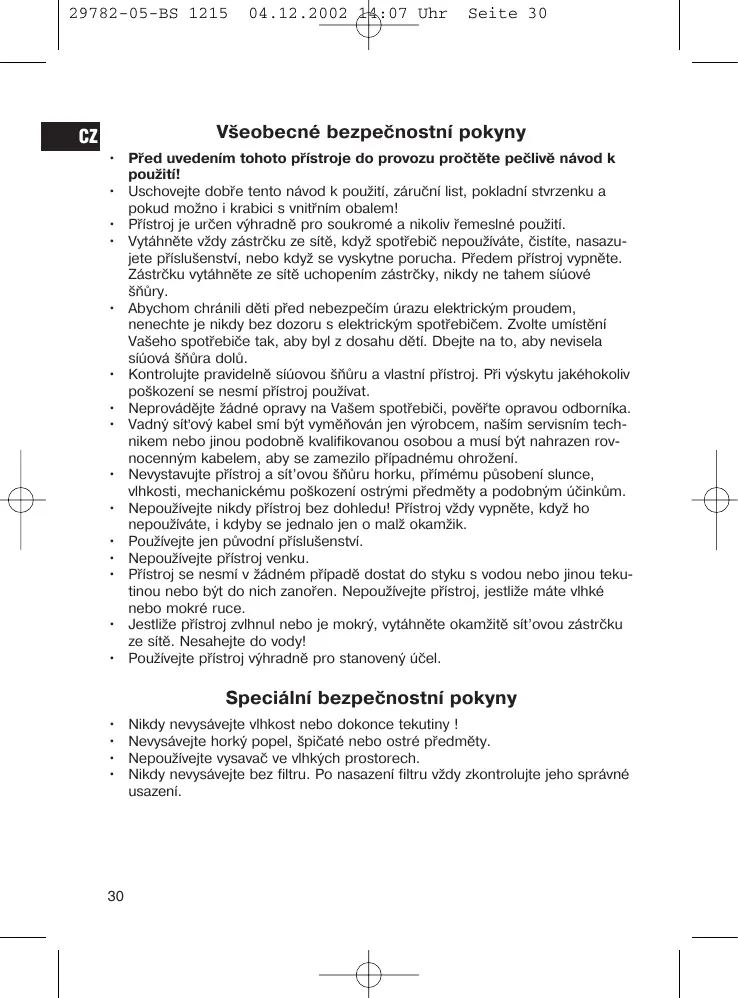 • Před uvedením tohoto přístroje do provozu pročtěte pečlivě návod k použití! • Uschovejte dobře tento návod k použití, záruční list, pokladní stvrzenku a pokud možno i krabici s vnitřním obalem! • Přístroj je určen výhradně pro soukromé a nikoliv řemeslné použití. • Vytáhněte vždy zástrčku ze sítě, když spotřebič nepoužíváte, čistíte, nasazujete příslušenství, nebo když se vyskytne porucha. Předem přístroj vypněte. Zástrčku vytáhněte ze sítě uchopením zástrčky, nikdy ne tahem síúové šňůry. • Abychom chránili děti před nebezpečím úrazu elektrickým proudem, nenechte je nikdy bez dozoru s elektrickým spotřebičem. Zvolte umístění Vašeho spotřebiče tak, aby byl z dosahu dětí. Dbejte na to, aby nevisela síúová šňůra dolů. • Kontrolujte pravidelně síúovou šňůru a vlastní přístroj. Při výskytu jakéhokoliv poškození se nesmí přístroj používat. • Neprovádějte žádné opravy na Vašem spotřebiči, pověřte opravou odborníka. • Vadný síťový kabel smí být vyměňován jen výrobcem, naším servisním technikem nebo jinou podobně kvalifikovanou osobou a musí být nahrazen rovnocenným kabelem, aby se zamezilo případnému ohrožení. • Nevystavujte přístroj a sít’ovou šňůru horku, přímému působení slunce, vlhkosti, mechanickému poškození ostrými předměty a podobným účinkům. • Nepoužívejte nikdy přístroj bez dohledu! Přístroj vždy vypněte, když ho nepoužíváte, i kdyby se jednalo jen o malž okamžik. • Používejte jen původní příslušenství. • Nepoužívejte přístroj venku. • Přístroj se nesmí v žádném případě dostat do styku s vodou nebo jinou tekutinou nebo být do nich zanořen. Nepoužívejte přístroj, jestliže máte vlhké nebo mokré ruce. • Jestliže přístroj zvlhnul nebo je mokrý, vytáhněte okamžitě sít’ovou zástrčku ze sítě. Nesahejte do vody! • Používejte přístroj výhradně pro stanovený účel.