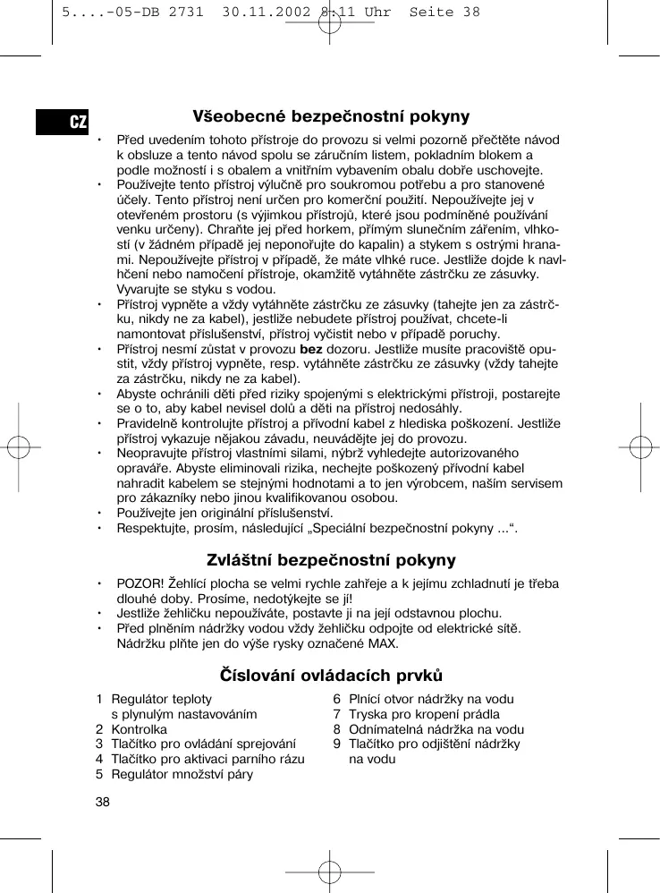 POZOR! Žehlící plocha se velmi rychle zahřeje a k jejímu zchladnutí je třeba dlouhé doby. Prosíme, nedotýkejte se jí! Jestliže žehličku nepoužíváte, postavte ji na její odstavnou plochu. Před plněním nádržky vodou vždy žehličku odpojte od elektrické sítě. Nádržku plňte jen do výše rysky označené MAX.