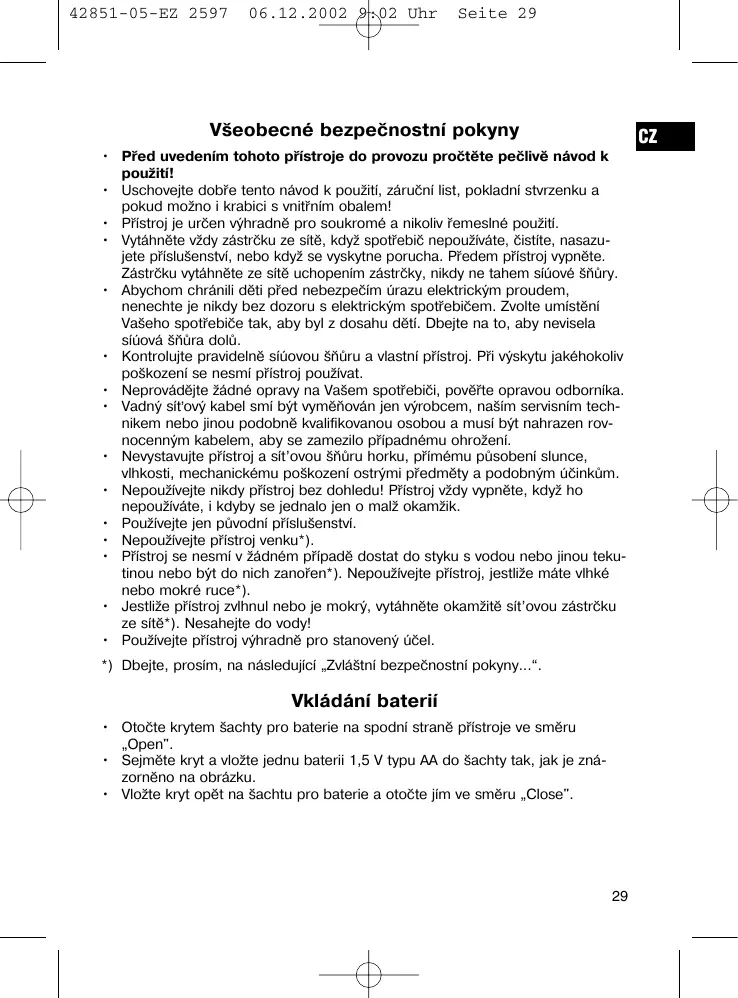 • Před uvedením tohoto přístroje do provozu pročtěte pečlivě návod k použití! • Uschovejte dobře tento návod k použití, záruční list, pokladní stvrzenku a pokud možno i krabici s vnitřním obalem! • Přístroj je určen výhradně pro soukromé a nikoliv řemeslné použití. • Vytáhněte vždy zástrčku ze sítě, když spotřebič nepoužíváte, čistíte, nasazujete příslušenství, nebo když se vyskytne porucha. Předem přístroj vypněte. Zástrčku vytáhněte ze sítě uchopením zástrčky, nikdy ne tahem síúové šňůry. • Abychom chránili děti před nebezpečím úrazu elektrickým proudem, nenechte je nikdy bez dozoru s elektrickým spotřebičem. Zvolte umístění Vašeho spotřebiče tak, aby byl z dosahu dětí. Dbejte na to, aby nevisela síúová šňůra dolů. • Kontrolujte pravidelně síúovou šňůru a vlastní přístroj. Při výskytu jakéhokoliv poškození se nesmí přístroj používat. • Neprovádějte žádné opravy na Vašem spotřebiči, pověřte opravou odborníka. • Vadný síťový kabel smí být vyměňován jen výrobcem, naším servisním technikem nebo jinou podobně kvalifikovanou osobou a musí být nahrazen rovnocenným kabelem, aby se zamezilo případnému ohrožení. • Nevystavujte přístroj a sít’ovou šňůru horku, přímému působení slunce, vlhkosti, mechanickému poškození ostrými předměty a podobným účinkům. • Nepoužívejte nikdy přístroj bez dohledu! Přístroj vždy vypněte, když ho nepoužíváte, i kdyby se jednalo jen o malž okamžik. • Používejte jen původní příslušenství. • Nepoužívejte přístroj venku*). • Přístroj se nesmí v žádném případě dostat do styku s vodou nebo jinou tekutinou nebo být do nich zanořen*). Nepoužívejte přístroj, jestliže máte vlhké nebo mokré ruce*). • Jestliže přístroj zvlhnul nebo je mokrý, vytáhněte okamžitě sít’ovou zástrčku ze sítě*). Nesahejte do vody! • Používejte přístroj výhradně pro stanovený účel. *) Dbejte, prosím, na následující „Zvláštní bezpečnostní pokyny...“.