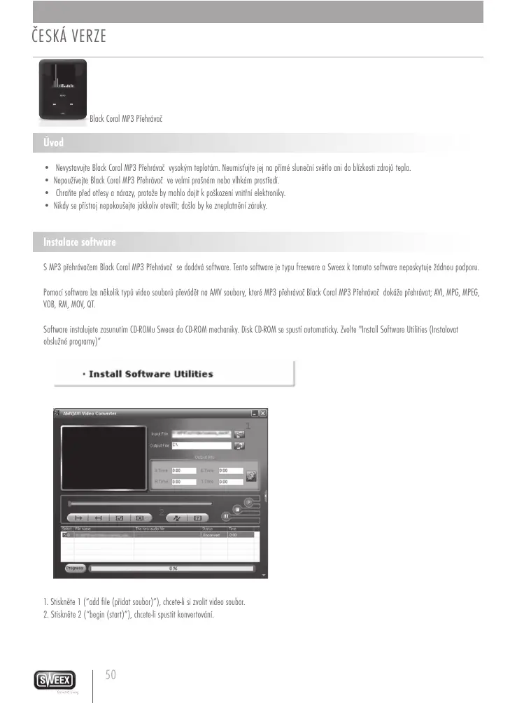 Nevystavujte Black Coral MP3 Přehrávač vysokým teplotám. Neumisťujte jej na přímé sluneční světlo ani do blízkosti zdrojů tepla. Nepoužívejte Black Coral MP3 Přehrávač ve velmi prašném nebo vlhkém prostředí. Chraňte před otřesy a nárazy, protože by mohlo dojít k poškození vnitřní elektroniky. Nikdy se přístroj nepokoušejte jakkoliv otevřít; došlo by ke zneplatnění záruky. Instalace software S MP3 přehrávačem Black Coral MP3 Přehrávač se dodává software. Tento software je typu freeware a Sweex k tomuto software neposkytuje žádnou podporu. Pomocí software lze několik typů video souborů převádět na AMV soubory, které MP3 přehrávač Black Coral MP3 Přehrávač dokáže přehrávat; AVI, MPG, MPEG, VOB, RM, MOV, QT. Software instalujete zasunutím CD-ROMu Sweex do CD-ROM mechaniky. Disk CD-ROM se spustí automaticky. Zvolte "Install Software Utilities (Instalovat obslužné programy)”