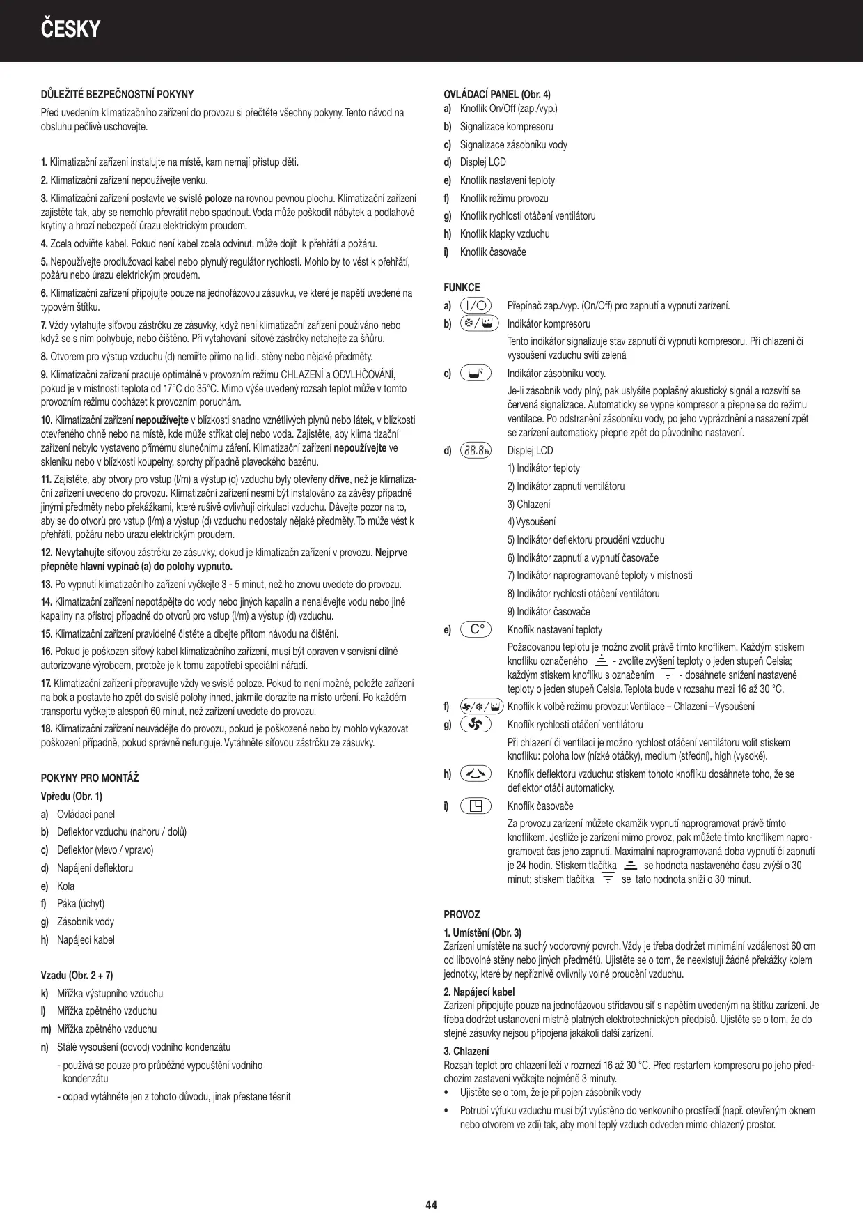 c) Lamelles (à gauche / à droite) d) Grille sortie d’air e) Rouleaux f) Poignée de transport g) Réservoir d’eau h) Câble du secteur