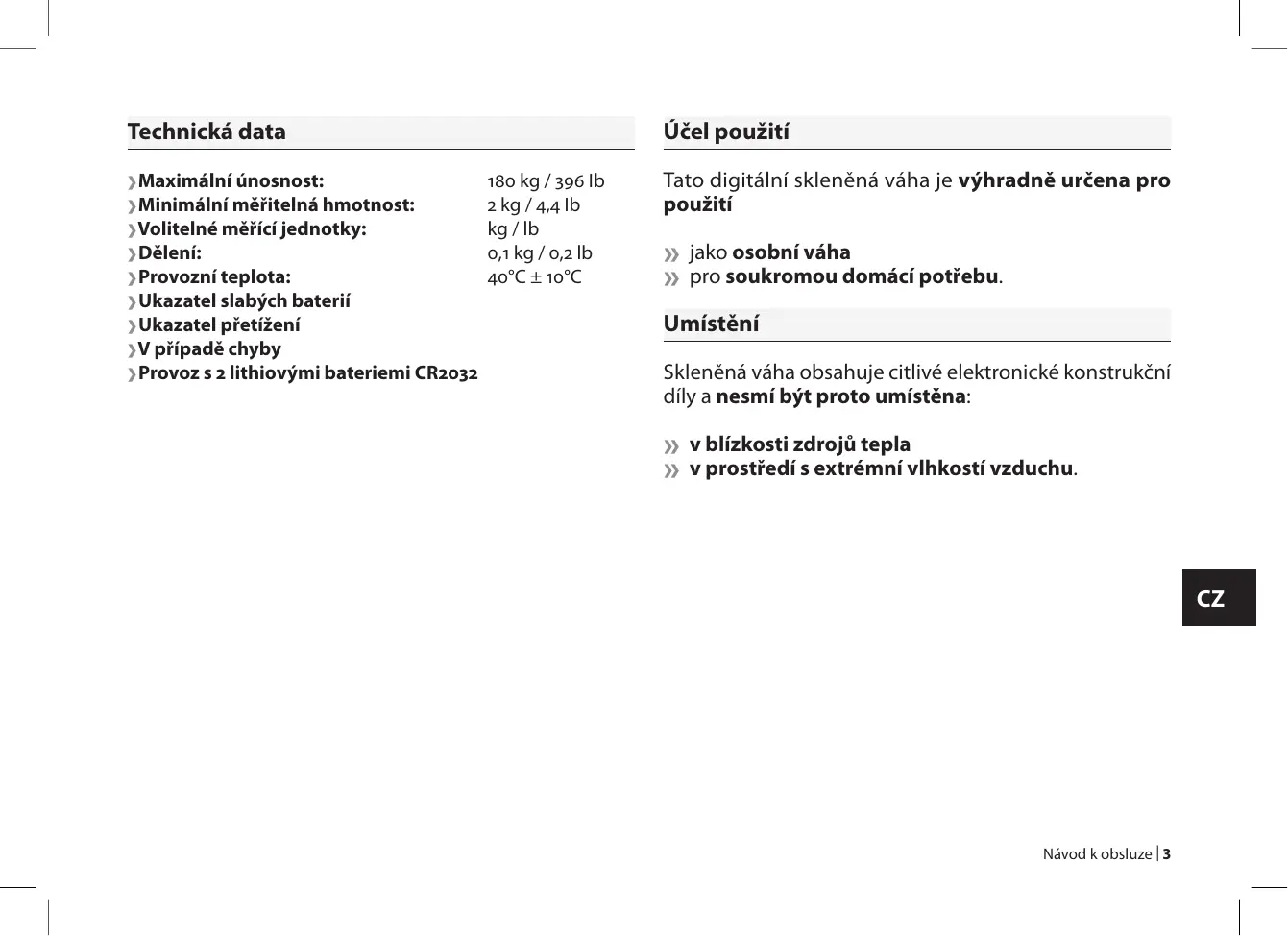 | Návod k obsluze Technická data Účel použití kg / Ib ›Maximální únosnost: Minimální měřitelná hmotnost: kg / , Ib Volitelné měřící jednotky: kg / lb Dělení: , kg / , lb Provozní teplota: °C ± °C Ukazatel slabých baterií › Ukazatel přetížení ›V případě chyby › Provoz s lithiovými bateriemi CR Tato digitální skleněná váha je výhradně určena pro použití » jako osobní váha » pro soukromou domácí potřebu. Umístění Skleněná váha obsahuje citlivé elektronické konstrukční díly a nesmí být proto umístěna: » v blízkosti zdrojů tepla » v prostředí s extrémní vlhkostí vzduchu.