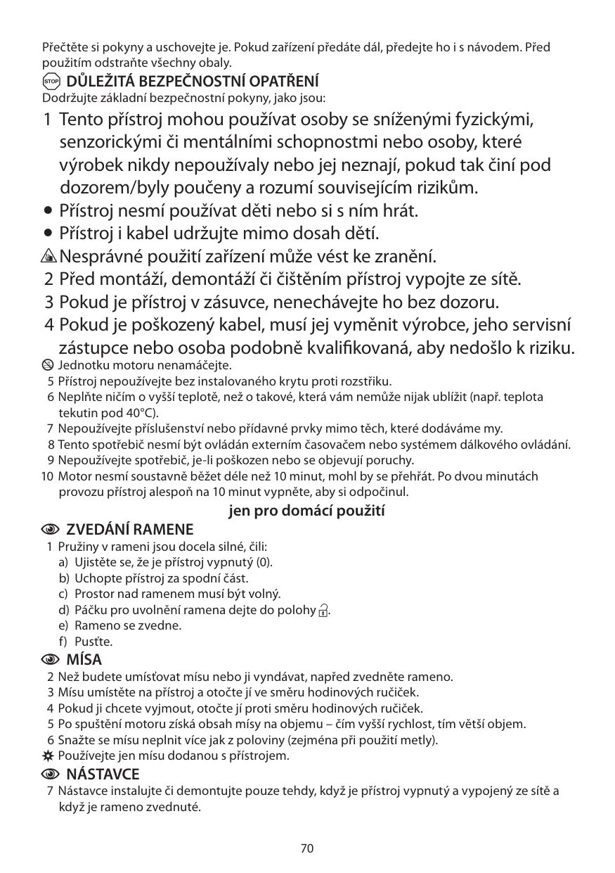 zästupce nebo osoba podobné kvalifikované, aby nedoëlo k riziku. © Jednotku motoru nenamäéejte. 5 Pristroj nepouñiveite bez instalovaného krytu proti rozstriku. 6 Neplñte niëim o vy33i teploté, nez o takové, kterä väm nemüe nijak ublizit (napi. teplota tekutin pod 40°C). 7 Nepouñiveite prislugenstvi nebo pidavné prvky mimo téch, které dodäväme my. 8 Tento spotiebié nesmi byt ovlädän externim éasovaéem nebo systémem délkového ovlédäni. 9 Nepouzivejte spotrebi, je-li poskozen nebo se objevuji poruchy. 10 Motor nesmi soustavné bëzet déle nez 10 minut, mohl by se prehïät. Po dvou minutäch provozu piistroj alespoñ na 10 minut vypnête, aby si odpoëinul.