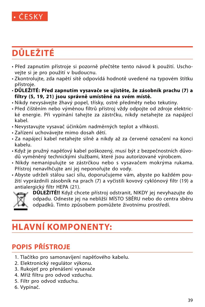 DÜLEZITÉ + Pied zapnutim péistroje si pozorné pieëtéte tento névod k pougiti. Uscho- veite si je pro pouziti v budoucnu. + Zkontrolujte, zda napéti sité odpovidé hodnoté uvedené na typovém 3titku pristroje. + DÜLEZITÉ: Pied zapnutim vysavaée se ujistëte, Ze zäsobnik prachu (7) a filtry (5, 19, 21) jsou sprâvné umisténé na svém misté. + Nikdy nevysévejte Zhavÿ popel, tiisky, ostré pfedméty nebo tekutiny. + Pred éiäténim nebo vÿménou filtrü pristroj vdy odpojte od zdroje elektric- ké energie. Pfi vypinéni tahejte za zästréku, nikdy netahejte za napéjeci kabel. + Nevystavuite vysavaë üéinküm nadmërnÿch teplot a vihkosti. + Zaïizeni uchovävejte mimo dosah dëti. + Za napäjeci kabel netahejte silnë a nikdy az za éervené oznaëeni na konci kabelu. + KdyZ je pruënÿ napétovÿ kabel poëkozenÿ, musi bÿt z bezpeënostnich düvo- dû vyménënÿ technickÿmi sluzbami, které jsou autorizované vÿrobcem. + Nikdy nemanipulujte se zästrékou nebo s vysavaéem mokrÿma rukama. Pistroj nenavlhéujte ani jej neponoïujte do vody. + Abyste udrzeli stélou saci silu, doporuëujeme vâm, abyste po kaëdém pou- Zité vyprézdnili zäsobnik na prach (7) a vyéistili kovovÿ cyklénovÿ filtr (19) a antialergickÿ filtr HEPA (21). D: DÜLEZITÉ!! Kdy2 chcete pristroj odstranit, NIKDY jej nevyhazujte do odpadu. Odneste jej na neblizsi MISTO SBÉRU nebo do centra sbéru odpadkü. Timto zpüsobem pomügete Zivotnimu prostredi. HLAVNI KOMPONENTY: POPIS PRISTROJE