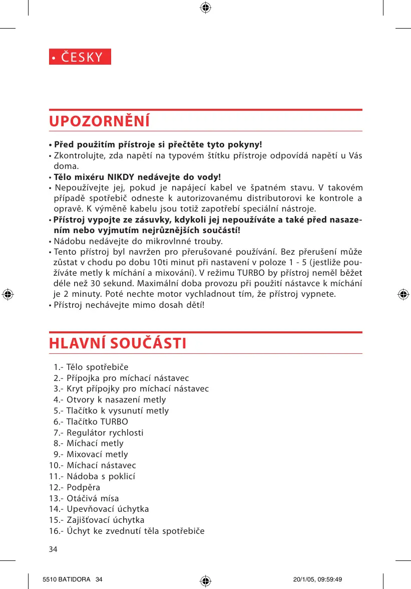 KO] UPOZORNENI + Pred pouzitim pristroje si preëtète tyto pokyny! + Zkontrolujte, zda napéti na typovém ëtitku pristroje odpovidä napéti u Väs doma. + Télo mixéru NIKDY nedävejte do vody! + Nepouñivejte jej, pokud je napäjeci kabel ve $patném stavu. V takovém pripadë spotrebié odneste k autorizovanému distributorovi ke kontrole a opravé. K vÿméné kabelu jsou totiz zapotrebi specilni nästroje. + Pristroj vypojte ze zésuvky, kdykoli jej nepouziväte a také pred nasaze- nim nebo vyjmutim nejrüznéjäich souéästi! + Nédobu nedävejte do mikrovinné trouby. + Tento piistroj byl navren pro pieruëované pouziväni. Bez pieru$eni müze züstat v chodu po dobu 10ti minut pri nastaveni v poloze 1 - 5 (jestliäe pou- Zivéte metly k michäni a mixoväni). V rezimu TURBO by piistroj nemël bézet déle nez 30 sekund. Maximäini doba provozu pri pouziti nâstavce k michäni je 2 minuty. Poté nechte motor vychladnout tim, ze pistroj vypnete. + Pristroj nechävejte mimo dosah déti! HLAVNI SOUCASTI 1 Télo spotiebiée