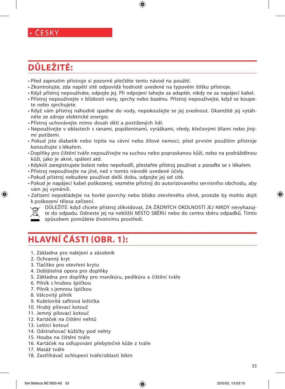 - Z bezpečnostnich důvodů dobíjtelná opora pro doplěkny (4) bude pracovat, pouze když je zá-kladna pro doplěkny (5), zastřihávac tváře a oblasti bikin (18) nebo klestě na očné rasy (22) pripevněny správně.