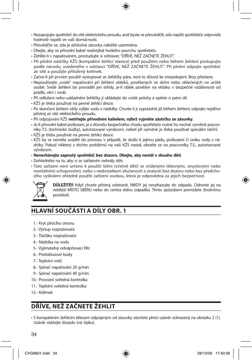 | | cvensorimea 24 + Nezapojujte spotiebié do sité elektrického proudu, ani byste se piesvédéil zda napèti spotiebiée odpovidä hodnoté napëti ve vaëi domécnosti - Presvédéte se, zda je prisluënä zäsuvka néleäité uzemnéna. + Dbeite, aby se privodni kabel nedotÿkal horkého povrchu spotrebiée. Zehlitedi s napafovénim, prostudujte si odstavec "DRIVE, NEZ ZACNETE ZEHLI + Pi plnéni nédréky KZ (kompaktni 2ehlici stanice) pied pouzitim nebo béhem Zehleni postupuite podle nâvodu, uvedeného v odstavci "DRIVE, NEZ ZAËNETE ZEHLIT” Pi plnéni odpojte spotrebié ze sité a pouäijte prilozenÿ kelimek. + Zaëne-li pi prynim pouñiti vystupovat ze Zehliëky pâra, neni to düvod ke anepokojeni. Brzy piestane. + Nepouñiveite ,svislé” napañoväni pri ehleni oblekü, povésenÿch ve skïni nebo obleéenÿch na urëité osobé. Svislé Zehleni I provädét jen tehdy, je-i oblek povésen na véséku v bezpeëné vzdélenosti od prädla, véci i osob. - Pfi odloäeni nebo uskladnëni Zehliéky ji uklédejte do svislé polohy a opiete o patni dil + K2S je tieba pouzivat na pevné Zehlici desce. iehleni védy vylite vodu z nâdräky. Chcetei ji vyprézdhit ji béhem 2ehleni, odpojte nejdive elektrického proudu. podini kabel poëkozen, je z düvodu bezpeëného chodu spotebiée nutné ho nechat vymënit pracov- niky TS. (technické sluzby), autorizované vÿrobcem, nebot pri vméné je tieba pouäivat speciäini nâi + K2S je tieba pouzivat na pevne Zehlici desce. + K2S by se neméla uvädét do provozu v pripadë, ze doëlo k jejmu pädu, poëkozeni ëi üniku vody z né- dréky. Pokud nékterÿ z téchto problémü na vasi K2S nastal, obratte se na pracovniky TS, autorizované vÿrobcem. + Nenechävejte zapnutÿ spotiebié bez dozoru. Dbejte, aby nestäl v dosahu déti + Dohlédnète na to, aby si se zafizenim nehräly dèti + Toto zaïizeni neni uréeno k pouziti lidmi (véetné dëti) se snizenÿmi télesnÿmi, smyslovÿmi nebo mentälnimi schopnostmi, nebo s nedostatkem zkuSenosti a znalosti bez dozoru nebo bez predcho- o vySkoleni ohledné pouziti zafizeni osobou, kterä je odpovédnä za jejich bezpeënost. DÜLEZITÉN Kdyz chcete piistroj odstranit, NIKDY jej nevyhazujte do odpadu. Odneste jej na nebliäsi MISTO SBÉRU nebo do centra sbéru odpadkü. Timto zpüsobem pomüete äivotnimu prostredi.