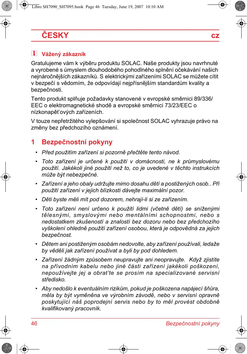 7 a an Libro SH7090_SH7095.book Page 46 Tuesday, June 19, 2007 10:10 AM 7 CESKY cz (&] Väzenÿ zäkaznik Gratulujeme väm k vÿbèru produktu SOLAC. Naëe produkty jsou navrhnuté a vyrobené s ümyslem dlouhodobého pohodiného spinëni oëekäväni naëich nejnäroënëjSich zäkaznikü. S elektrickÿmi zaïizenimi SOLAC se müzete citit v bezpeëi s védomim, Ze odpovidaji nejprisnèj$im standardüm kvality a bezpeënosti. Tento produkt splñuje poZadavky stanovené v evropské smèrnici 89/336/ EEC o elektromagnetické shodë a evropské smërnici 73/23/EEC o nizkonapét'ovÿch zaïizenich. V touze nepretrzitého vylepsoväni si spoleënost SOLAC vyhrazuje prâvo na zmëny bez p'edchoziho oznâmeni. 1 Bezpeënostni pokyny + _Pred pouzitim zaïizeni si pozorné preëtète tento nävod. + Toto zaïïzeni je uréené k pouiti v domäcnosti, ne k prümyslovému pouiiti. Jakékoli jiné pouziti nez to, co je uvedené v téchto instrukcich müûze byt nebezpeëné. Zaïïzeni a jeho obaly udrzujte mimo dosahu dëti a postizenÿch osob.. Pñ pouiiti zaïizeni v jejich blizkosti dâvejte maximäini pozor. Dèéti byste mëli mit pod dozorem, nehraji-li si ze zaïzenim. Toto zaïizeni neni urèeno k pouiti lidmi (véetné dëti) se snizenÿmi télesnÿmi, smyslovÿmi nebo mentélnimi schopnostmi, nebo s nedostatkem zku$enosti a znalosti bez dozoru nebo bez predchoziho vySkoleni ohledné pouziti zaïizeni osobou, které je odpovèdnä za jejich bezpeënost. Déëtem ani postizenÿm osobäm nedovolte, aby zaïizeni pouzivali, ledaze by védéli jak zaïizeni pouzivat a byli by pod dohledem. Zaïizeni Zädnÿm zpüsobem neupravujte ani neopravujte. Kdyz zjistite na privodnim kabelu nebo jiné ëâsti zaïizeni jakékoli po$kozeni, nepouivejte jej a obrat'te se prosim na specializované servisni stredisko. Aby nedoëlo k eventuäinim riziküm, pokud je poëkozena napäjeci méla by bÿt vymënëna ve vyrobnim zävodë, nebo v servisni opravnè poskytujici n4$ poprodejni servis nebo by to mël provést obdobnè kvalifikovanÿ pracovnik. 46 Bezpeënostni pokyny
