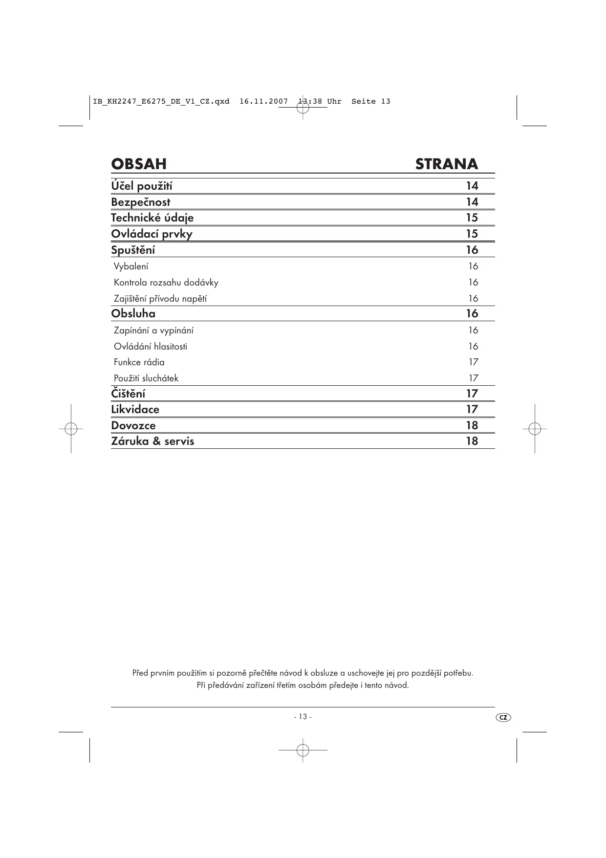 OBSAH TT STRANA Uëel pouziti 14 Bezpeënost 14 Technické üdaje 15 Ovlédaci prvky 15 Spuëténi 16 Vybalent 16 Kontrola rozsahu dodévky 16 Zajiëtëni privodu napëti 16 Obsluha 16 Zapinéni a vypinéni 16 Ovlédäni hlasitosti 16 Funkce rédia 17 Pouiti sluchätek 17 Cisténi 17 Likvidace 17 Dovozce 18 Zéruka & servis 18