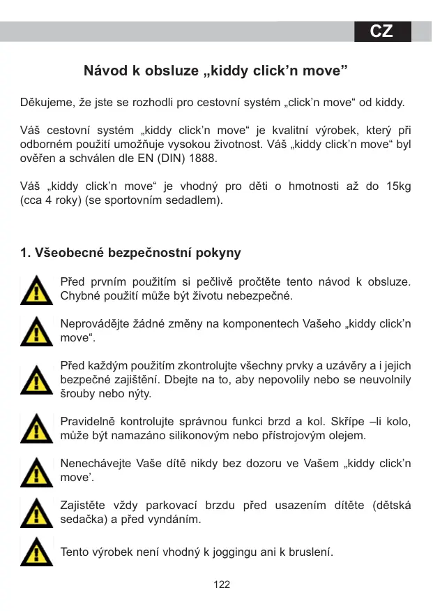 «kiddy click’n move» a été contrôlé et homologué pour répondre à la norme EN (DIN) 1888. Votre «kiddy click’n move» est conçu pour les enfants (4 ans env.) jusqu’à 15 kilos (avec siège poussette).