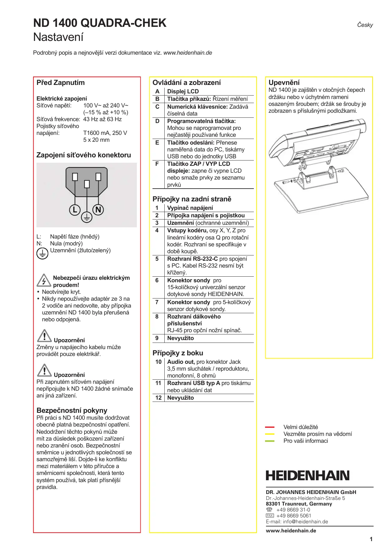 Vypínač napájení Přípojka napájení s pojistkou Uzemnění (ochranné uzemnění) Vstupy kodéru, osy X, Y, Z pro lineární kodéry osa Q pro rotační kodér. Rozhraní se specifikuje v době koupě. Rozhraní RS-232-C pro spojení s PC. Kabel RS-232 nesmí být křížený. Konektor sondy pro 15-kolíčkový univerzální senzor dotykové sondy HEIDENHAIN. Konektor sondy pro 5-kolíčkový senzor dotykové sondy. Rozhraní dálkového příslušenství RJ-45 pro opční nožní spínač. Nevyužito Přípojky z boku 10 Audio out, pro konektor Jack 3,5 mm sluchátek / reproduktoru, monofonní, 8 ohmů 11 Rozhraní USB typ A pro tiskárnu nebo ukládání dat 12 Nevyužito Bezpečnostní pokyny Při práci s ND 1400 musíte dodržovat obecně platná bezpečnostní opatření. Nedodržení těchto pokynů může mít za důsledek poškození zařízení nebo zranění osob. Bezpečnostní směrnice u jednotlivých společností se samozřejmě liší. Dojde-li ke konfliktu mezi materiálem v této příručce a směrnicemi společnosti, která tento systém používá, tak platí přísnější pravidla. Velmi důležité Vezměte prosím na vědomí Pro vaši informaci DR. JOHANNES HEIDENHAIN GmbH Dr.-Johannes-Heidenhain-Straße 5 83301 Traunreut, Germany { +49 8669 31-0 | +49 8669 5061 E-mail: info@heidenhain.de www.heidenhain.de