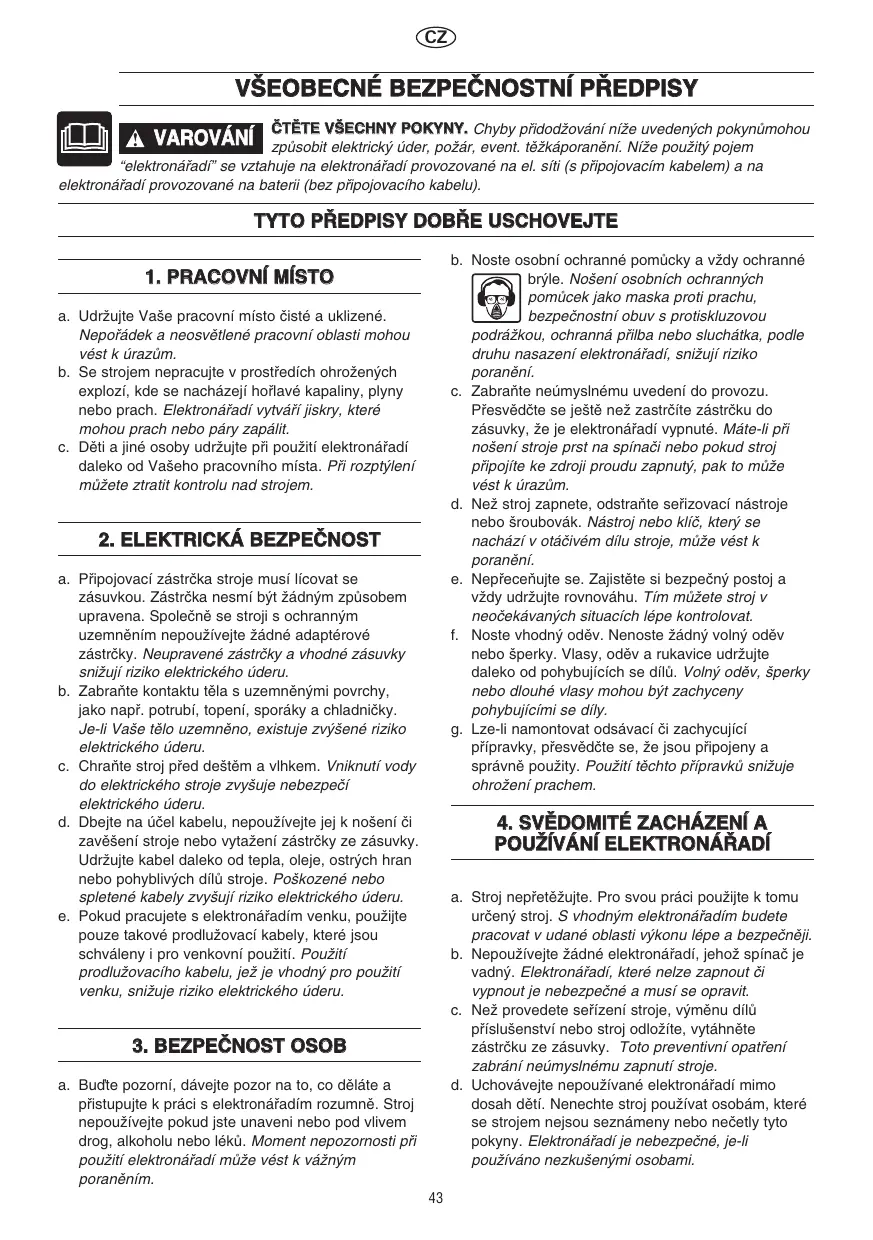 2. SECURITE ELECTRIQUE a. La fiche de l’outil électroportatif doit être appropriée à la prise de courant. Ne modifiez en aucune circonstance la fiche. N’employez pas d’adaptateur avec les outils électroportatifs mis à la terre. L’utilisation de fiches non modifiées et de prises appropriées réduira le risque de choc électrique. b Evitez tout contact corporel avec des éléments reliés à la terre, tels que tuyauterie, radiateurs, cuisinières, réfrigérateurs. La mise à la terre du corps accroît le risque de choc