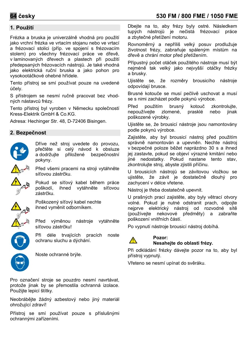 Dbejte na to, aby frézy byly ostré. Následkem tupých nástrojů je nečistá frézovací práce a zbytečné přetížení motoru. Frézka a bruska je univerzálně vhodná pro použití jako vrchní frézka ve vrtacím stojanu nebo ve vrtací a frézovací stolici (příp. ve spojení s frézovacím stolem) pro všechny frézovací práce ve dřevě, v laminovaných dřevech a plastech při použití předepsaných frézovacích nástrojů. Je také vhodná jako elektrická ruční bruska a jako pohon pro vysokootáčkové ohebné hřídele. Tento přístroj se smí používat pouze na uvedené účely. S přístrojem se nesmí ručně pracovat bez vhodných nástavců frézy. Tento přístroj byl vyroben v Německu společností Kress-Elektrik GmbH & Co.KG. Adresa: Hechinger Str. 48, D-72406 Bisingen. Dříve než stroj uvedete do provozu, přečtěte si celý návod k obsluze a dodržujte přiložené bezpečnostní pokyny. Před všemi pracemi na stroji vytáhněte síťovou zástrčku. Pokud se síťový kabel během práce poškodí, ihned vytáhněte síťovou zástrčku. Poškozený síťový kabel nechte ihned vyměnit odborníkem. vytáhněte Při déle trvajících pracích ochranu sluchu a dýchání. Přípustný počet otáček použitého nástroje musí být nejméně tak velký jako nejvyšší otáčky frézky a brusky. Ujistěte se, že rozměry odpovídají brusce. brousicího nástroje Brusné kotouče se musí pečlivě uschovat a musí se s nimi zacházet podle pokynů výrobce. Před použitím brusný kotouč nepoužívejte zlomené, prasklé poškozené výrobky. zkontrolujte, nebo jinak Ujistěte se, že brousicí nástroje jsou namontovány podle pokynů výrobce.