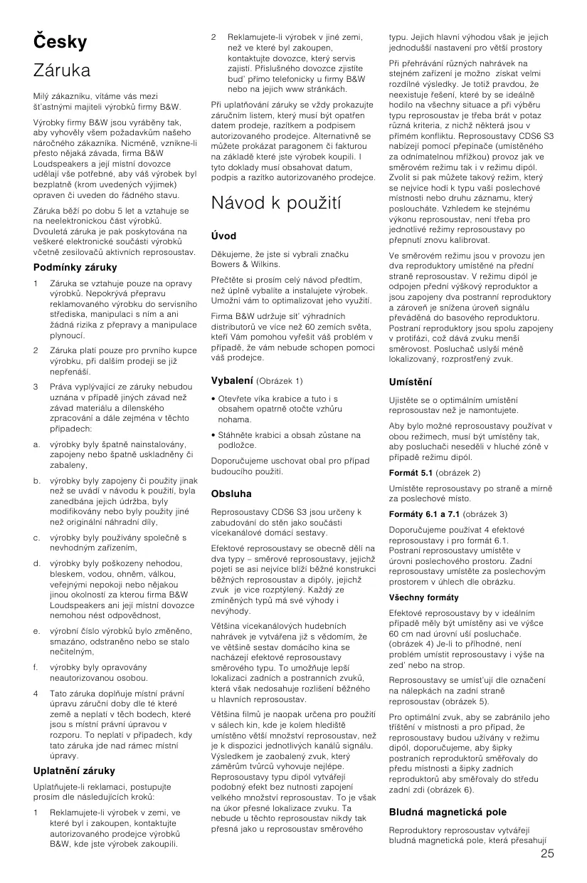 Vrobky fimy B&W jsou vyrébény tek aby vyhovély v£em pozadavküm naëcho näroëného zäkaznika. Nicméné, vzniknei plesto nëjaké zévada, fma BE Loudspeakers a jeji mistni dovozce udélaji vée potfebné, aby väë vÿrobek byi bezplatnë (krom uvedenÿch vÿimek) cpraven &i uveden do Fâdného stavu