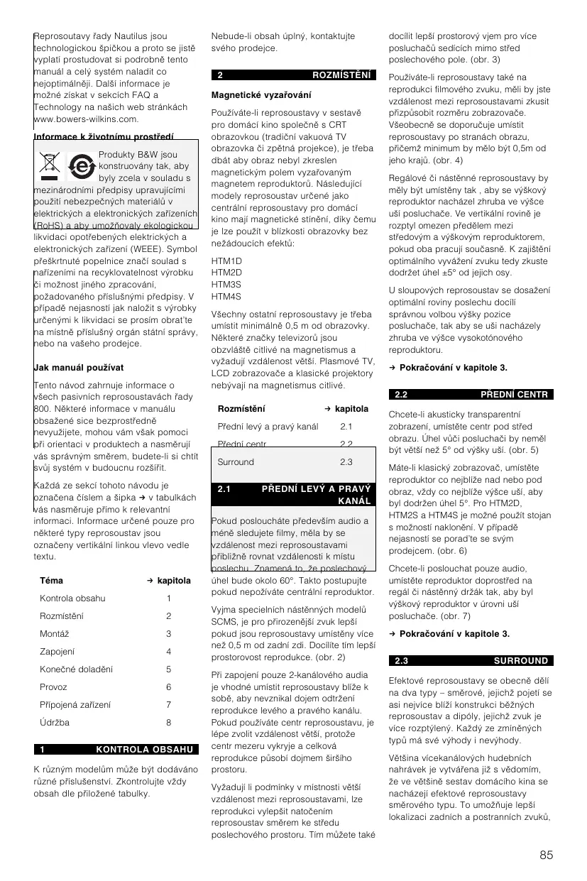 oraz w przypadku gdy wykonano juà naprawy lub modyfikacje przez firmy lub osoby nieautoryzowane. 4 Ta gwarancja jest dope¡nieniem prawnych podstaw udzielania gwarancji, obowiƒzujƒcych na terenie danego kraju i nie narusza statutowych praw klienta. Jak reklamowaπ sprz∆t na gwarancji Je·li zaistnieje potrzeba oddania produktu de serwisu, prosimy zastosowaπ si∆ do nast∆pujƒcej procedury: 1 Je·li sprz∆t jest uÃywany w kraju zakupu, powiniene· skontaktowaπ si∆ z autoryzowanym dealerem, u którego sprz∆t zosta¡ zakupiony. 2 Je·li sprz∆t jest uÃywany poza granicami kraju, powiniene· si∆ skontaktowaπ z dystrybutorem B&W w¡a·ciwym dla miejsca zamieszkania w celu uzyskania informacji, gdzie sprz∆t moÃe byπ serwisowany. MoÃesz zadzwoniπ do B&W w Wielkiej Brytanii lub odwiedziπ naszƒ witryn∆ internetowƒ aby uzyskaπ kontakt do lokalnego dystrybutora. Aby uczyniπ waÃnym Ãdanie gwarancyjne, naleÃy dostarczyπ oryginalnƒ faktur∆ sprzedaÃy lub inny dowód w¡asno·ci, zawierajƒcy dat∆ zakupu. "esky Uãivatelsk≥ manuál Mil≥ zákazníku D>kujeme, ãe jste si vybrali reprosoustavy zna#ky Bowers & Wilkins. U firmy jsme se vãdy _ídili filozofií Johna Bowerse, ve které se snoubí um>ní a v>da, design a zvuk. V|e je vedené snahou vytvo_it co nejlep|í produkt, kter≥ vás uspokojí jak p_i poslechu hudby, tak p_i sledování domácího kina. ]ada reprosoustav Nautilus 800 byla vãdy plná nejmodern>j|í technologie, coã z ní #inilo sv>tov> nejlépe prodávanou _adu reprosoustav v kategorii high-end. Ani p_es v≥|e _e#ené ná| team neusnul na vav_ínech a na|i v≥vojoví inãen≥_i se snaãili reprosoustavy této _ady nadále vylep|ovat. V následujících _ádkách se do#tete co je v této modernizované _ad> nového: Basová membrána je nyní tvo_ena sendvi#ovou konstrukcí z karbonov≥ch vláken vyztuãen≥ch p>nou Rohacell. Rigidní membrána je nejlep|í pro reprodukci basÅ a tato nová konstrukce dovoluje zpevnit membránu bez zvy|ování její hmotnosti. Toto extra zesílení membrány jí #iní efektivn> odolnou jakémukoli zbytkovému vln>ní vznikajícímu uvnit_ kabinetu, dává ohromující dynamiku a #asování basÅ s vedlej|ím efektem #ist|ích st_edÅ. FST st_edov≥ reproduktor dostal p_i zachování maximální otev_enosti prostoru za membránou nové siln>j|í |asi,coã minimalizuje neãádoucí odrazy a poskytuje membrán> volnost proud>ní vzduchu. Frekven#ní rozsah v|ech B&W vysokotónov≥ch reproduktorÅ byl vylep|en aã do nadakustick≥ch frekvencí – to je dÅleãité pro potenciál SACD a DVD-A nahrávek. Nyní mají top modely _ady v≥|kové reproduktory s diamantovou membránou. Je to sice velmi náro#né a drahé na v≥robu, dovoluje to v|ak reprodukci plného rozsahu do 80kHz s velmi hladk≥m prÅb>hem, coã #iní reproduktor lep|ím neã je mnoho jin≥ch superv≥|kov≥ch reproduktorÅ. Provedení vyhybky dodává signál reproduktorÅm s minimální degradací a minimálním p_ekr≥váním pásem. Pro tuto sérii na|i inãen≥_i pouãili mnoho nov≥ch pohledÅ na problematiku provedení filtrÅ. V≥sledkem je nevídan≥ prostor a stabilita reprodukce. Reprosoutavy _ady Nautilus jsou technologickou |pi#kou a proto se jist> vyplatí prostudovat si podrobn> tento manuál a cel≥ systém naladit co nejoptimáln>ji. Dal|í informace je moãné získat v sekcích FAQ a Technology na na|ich web stránkách www.bowers-wilkins.com. Informace k ãivotnímu prost_edí Produkty B&W jsou konstruovány tak, aby byly zcela v souladu s mezinárodními p_edpisy upravujícími pouãití nebezpe#n≥ch materiálÅ v elektrick≥ch a elektronick≥ch za_ízeních (RoHS) a aby umoã[ovaly ekologickou likvidaci opot_eben≥ch elektrick≥ch a elektronick≥ch za_ízení (WEEE). Symbol p_e|krtnuté popelnice zna#í soulad s na_ízeními na recyklovatelnost v≥robku #i moãnost jiného zpracování, poãadovaného p_íslu|n≥mi p_edpisy. V p_ípad> nejasností jak naloãit s v≥robky ur#en≥mi k likvidaci se prosím obrat’te na místn> p_íslu|n≥ orgán státní správy, nebo na va|eho prodejce. Jak manuál pouãívat Tento návod zahrnuje informace o v|ech pasivních reprosoustavách _ady